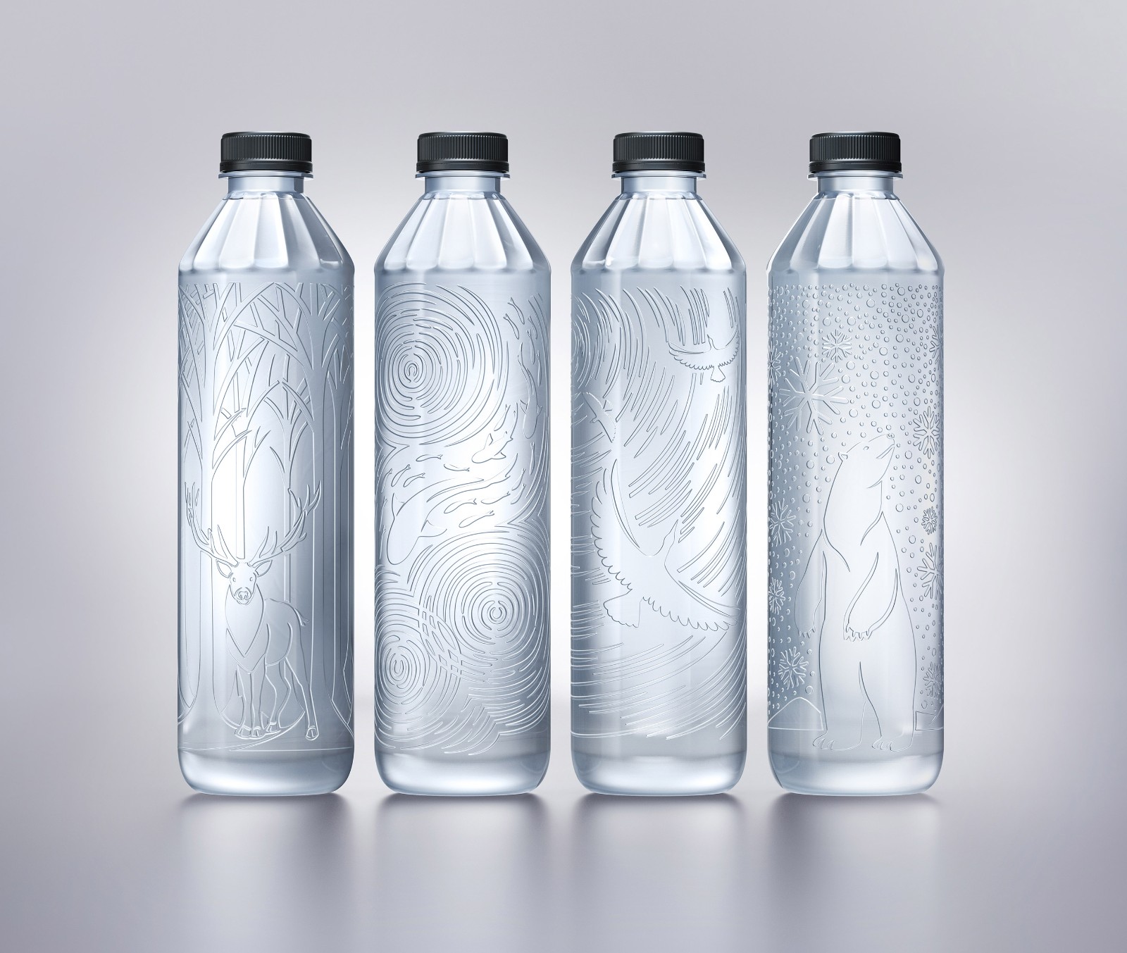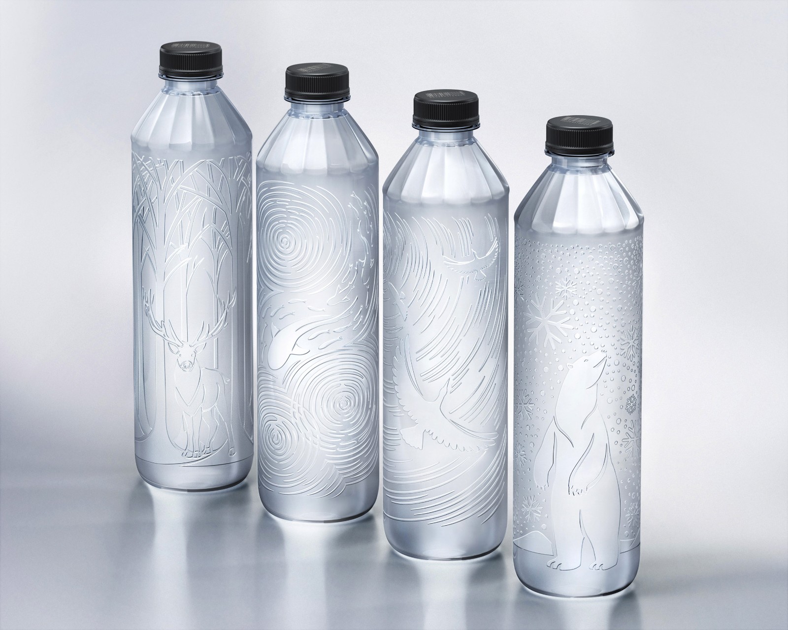 解決問題:為了解決這些問題,我們將所有法律要求的信息壓印在瓶身上,并在瓶蓋上打印條碼。此外,我們打算展示一組設(shè)計圖案,展示自然界中有趣的動物棲息地,并讓這些圖片(例如森林中的鹿,雪中行走的北極熊,天空中飛翔的鳥等)解釋其美環(huán)境的。