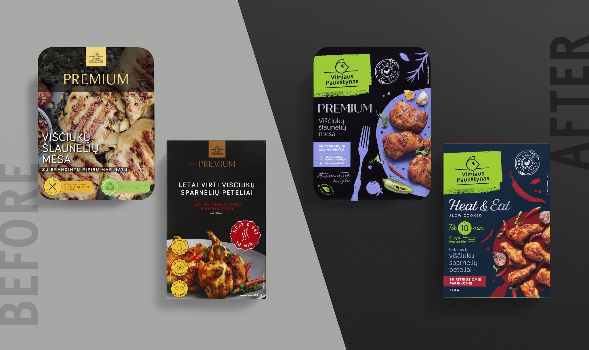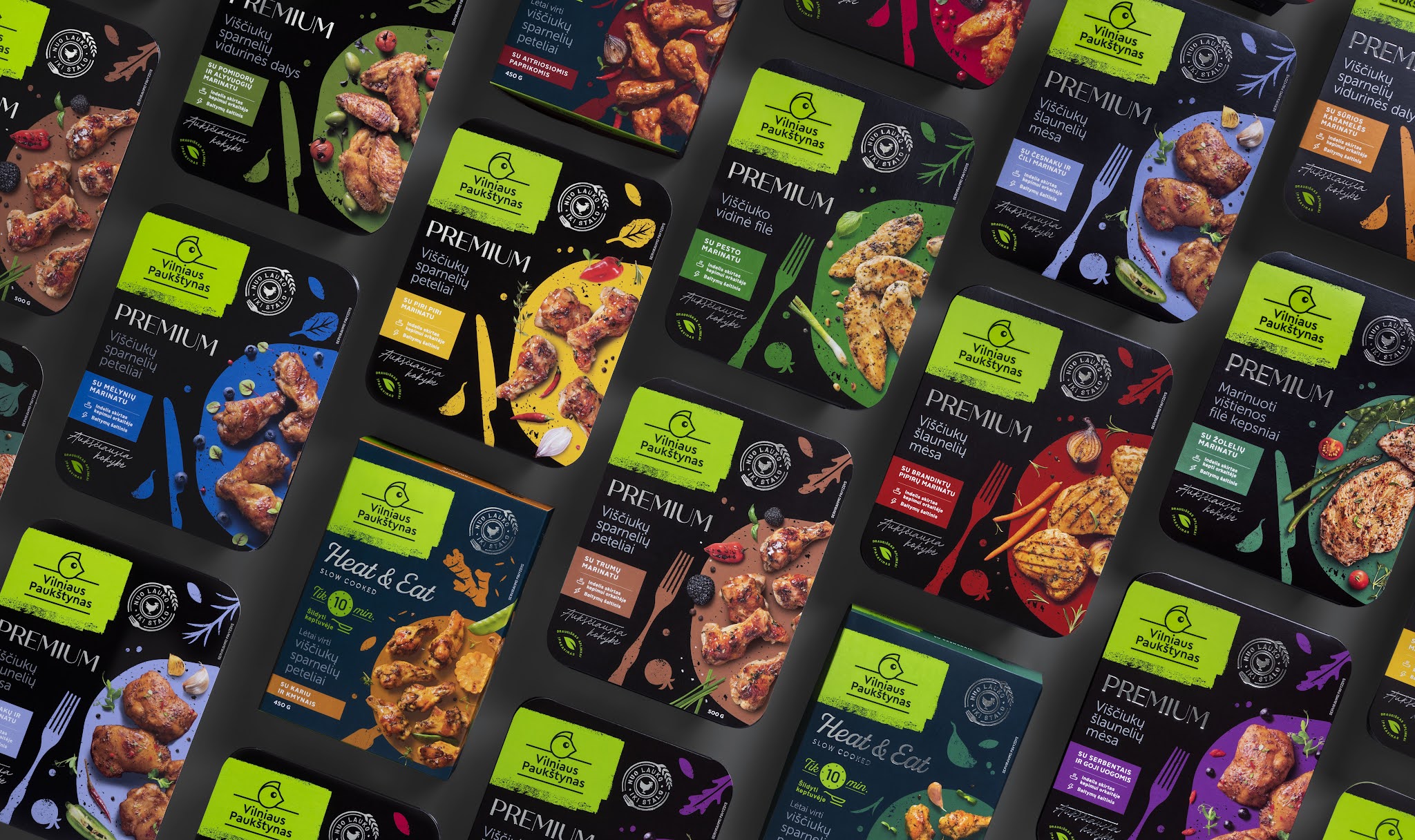 保險(xiǎn)費(fèi)我們保留了歷史線路名稱和黑色背景色。我們?cè)诰G色背景上添加了一個(gè)徽標(biāo),并選擇了符合該行命名的時(shí)尚排版。我們已經(jīng)從金色轉(zhuǎn)向銀色細(xì)節(jié),這些細(xì)節(jié)看起來(lái)更現(xiàn)代,與廚房用具相關(guān)。我們用背景色來(lái)區(qū)分加熱和食用產(chǎn)品,因?yàn)檫@些產(chǎn)品是經(jīng)過(guò)熱處理的。