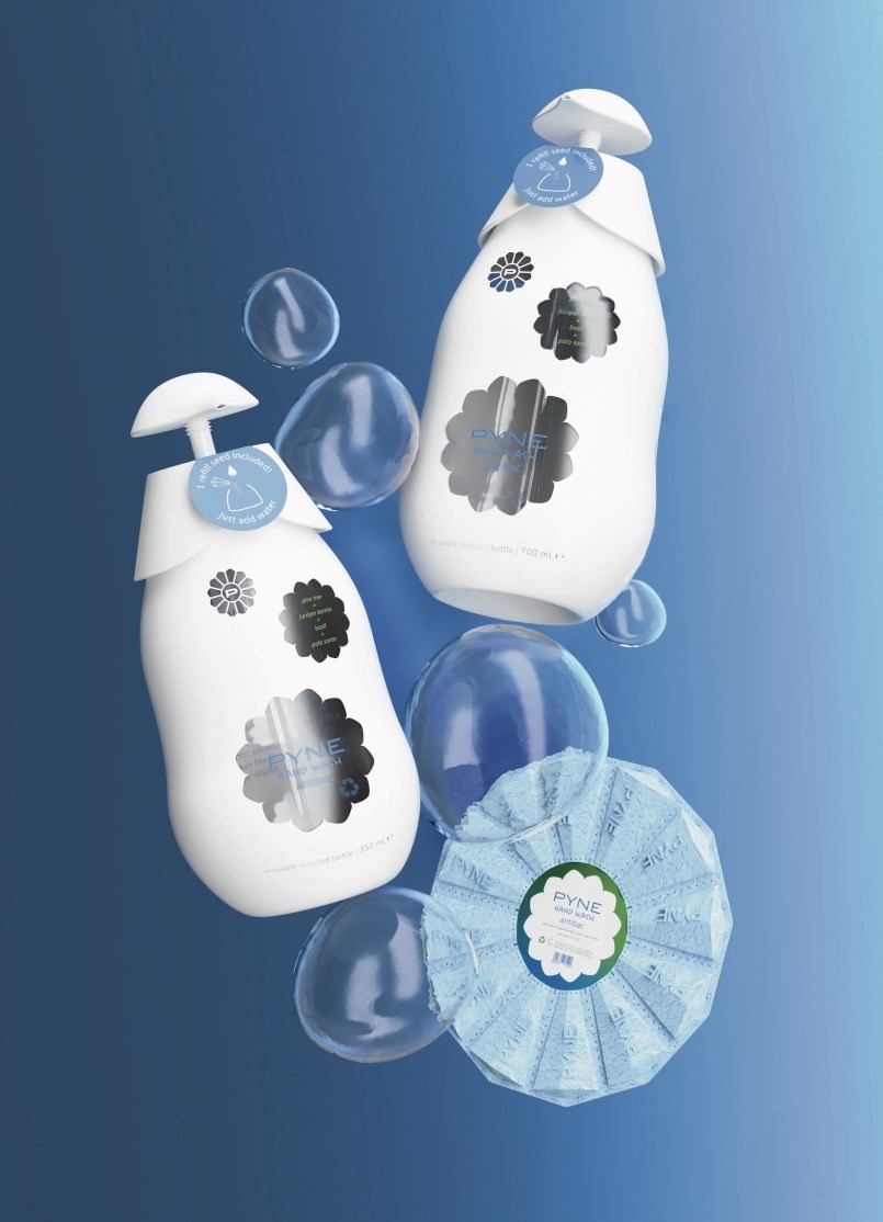 PYNE Hand Wash 是一個(gè)靈感來自松果的可再填充液體洗手液的概念品牌。該系列由三種香味組成:原創(chuàng)、抗菌和強(qiáng)烈限量版。每個(gè)配置文件都有不同的特征,但都基于松樹的味道,加上瓶子的形狀,整個(gè)體驗(yàn)是松果實(shí)體的翻譯。用戶通過將“再填充種子”開裂到瓶子中并與水混合來再填充瓶子。種子是由再生紙制成的豆莢,里面裝滿了粉末狀的產(chǎn)品,排列成 12 個(gè)環(huán),類似于松果的鱗片。