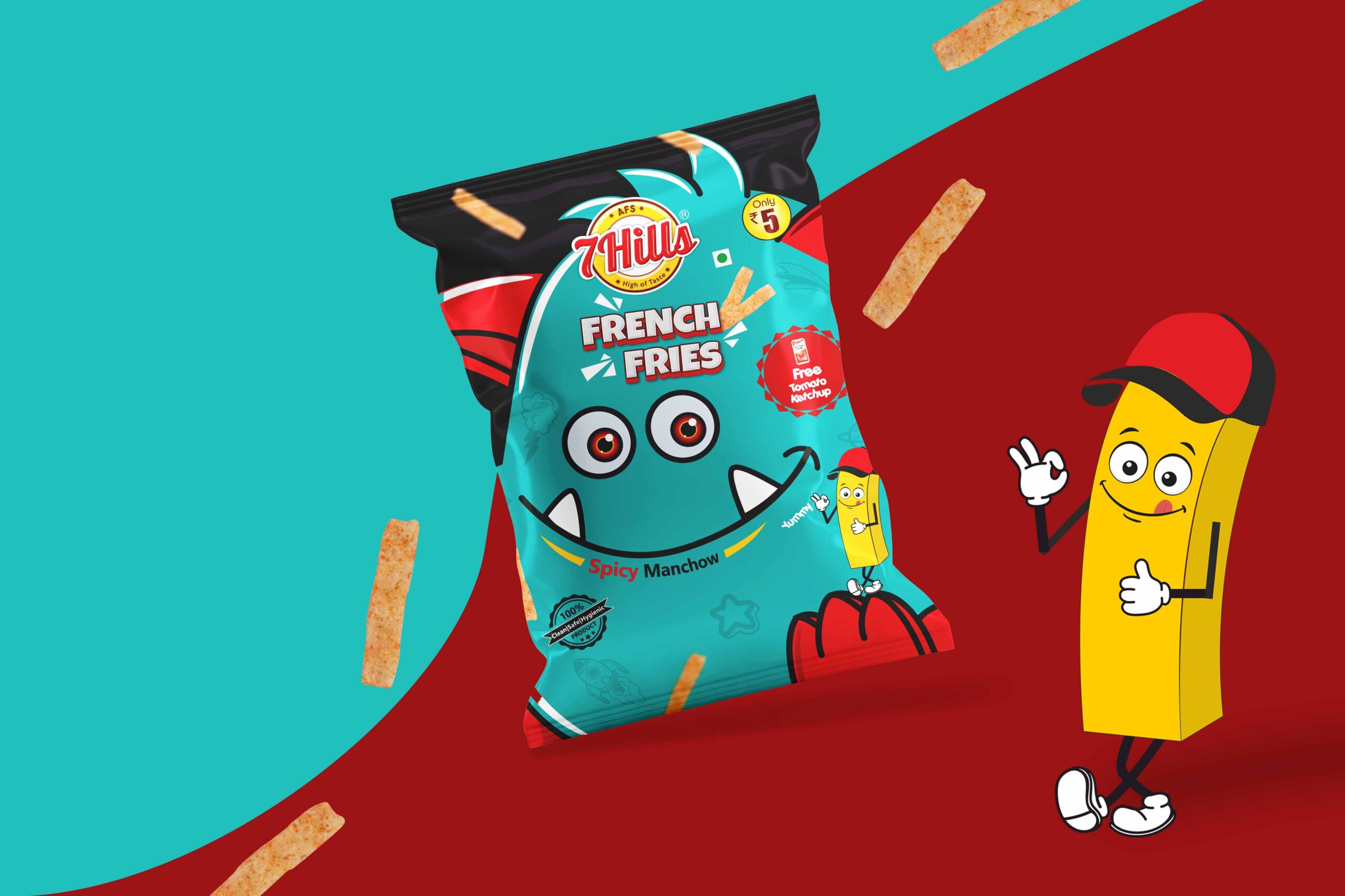 薯?xiàng)l:這包薯?xiàng)l的設(shè)計(jì)考慮到了薯?xiàng)l的辣味。包裝上的人物是一根薯?xiàng)l,戴著一頂可愛(ài)的帽子,這是通過(guò)繪畫(huà)創(chuàng)作的。這個(gè)設(shè)計(jì)的中心人物是水色的。