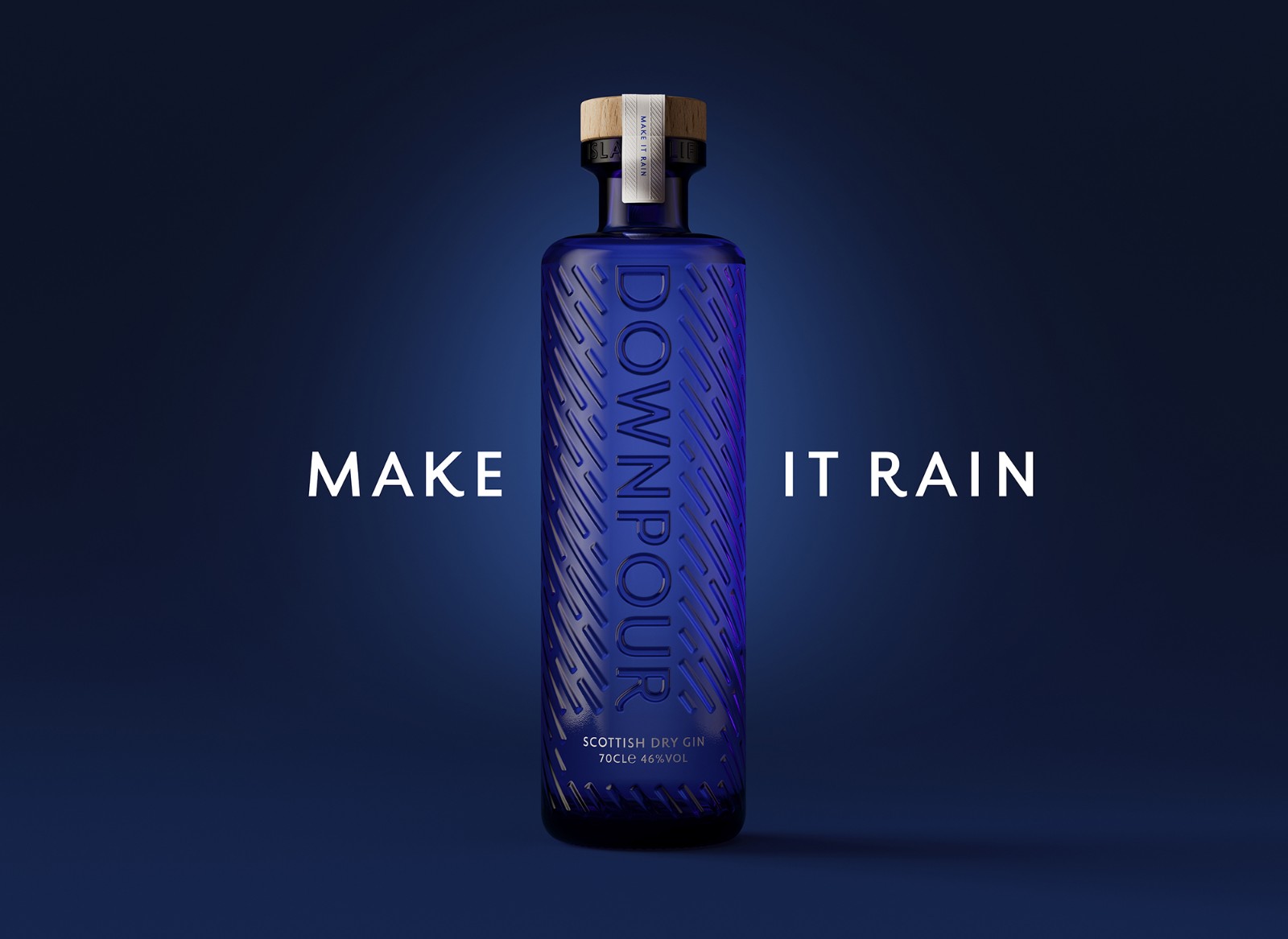 Jamhot與意大利玻璃瓶制造商Extrovit Elite合作,將設計推向了現實,傾盆大雨蘇格蘭干杜松子酒系列中的第一瓶酒用鮮艷的半透明藍色雨水裝飾,以補充品牌名稱和獨特的品牌圖案設計。