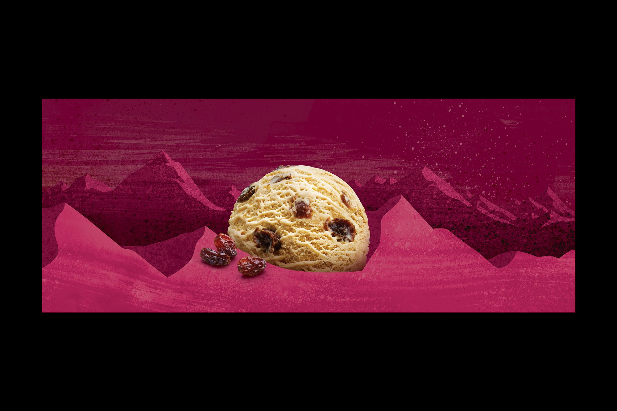 這兩升的大杯主要面向日常愛(ài)吃冰淇淋的消費(fèi)者。為了品牌凝聚力,方杯采用了為“Aspiring”打造的山脈概念。簡(jiǎn)約的風(fēng)景、明亮的流行色和簡(jiǎn)約的質(zhì)感,但冰淇淋仍然驕傲地放在中間,這表明這一系列產(chǎn)品是家庭的寵兒。新的兒童口味進(jìn)一步擴(kuò)大了這一范圍。將設(shè)計(jì)語(yǔ)言更進(jìn)一步,色彩豐富的山麓地帶通過(guò)引入面向兒童的排版和涂鴉,創(chuàng)造出更多層次,與冰淇淋攝影相互作用。