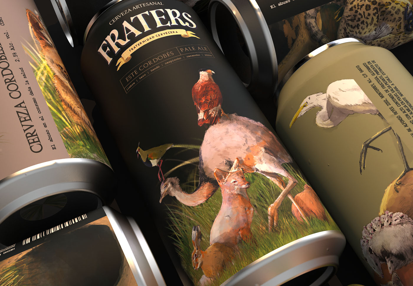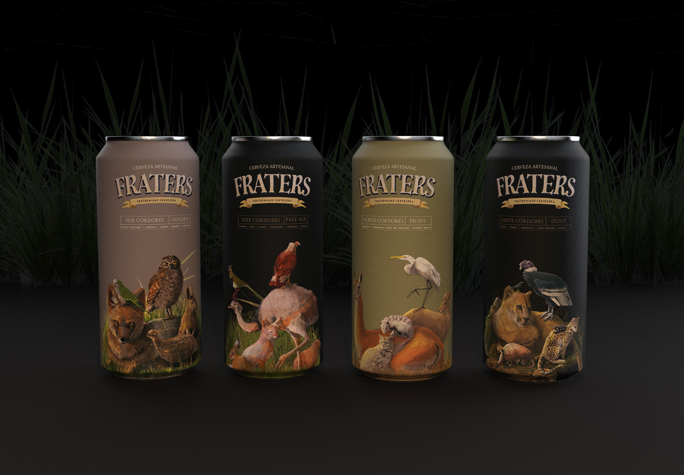 阿根廷科爾多瓦的弗拉特斯·塞爾維扎·阿泰薩納爾(Fraters Cerveza Artesanal)的數(shù)字插圖、罐頭藝術(shù)品和商品設(shè)計。這一概念是受該省北部、南部、東部和西部本土動物群的啟發(fā)而發(fā)展起來的。