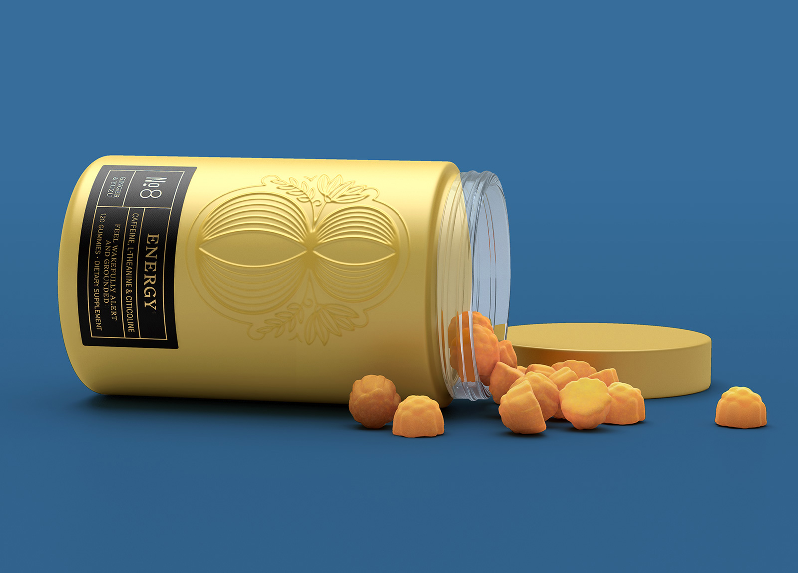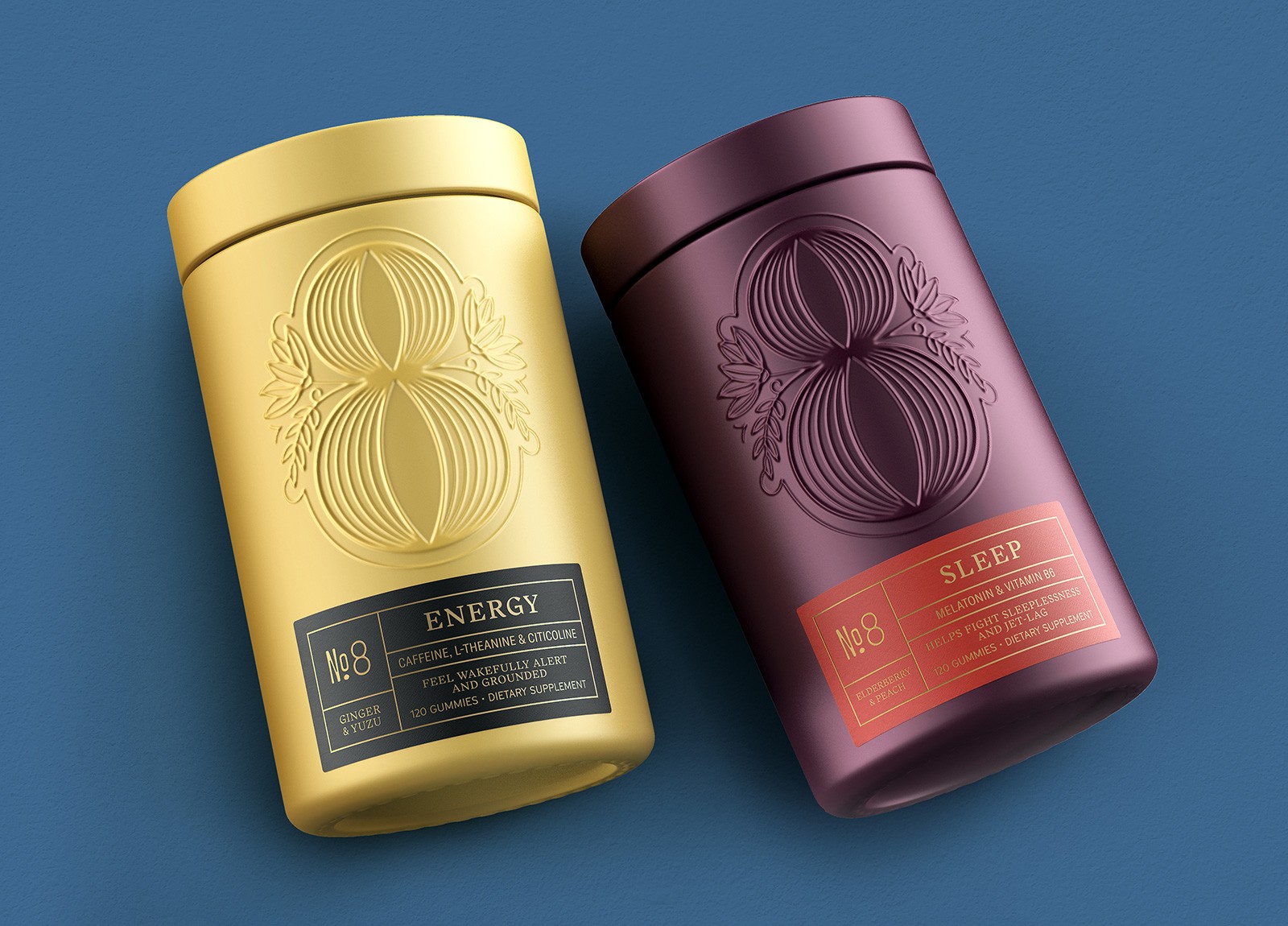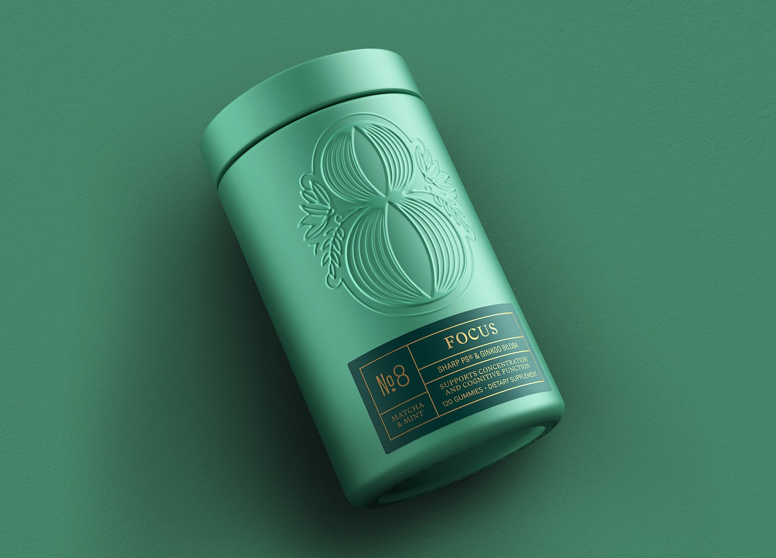 為了捕捉這種精神,我們創(chuàng)建了一個(gè)說(shuō)明性的數(shù)字 8 標(biāo)志作為品牌的核心。該標(biāo)記以植物元素和振幅線為特色,形象化了益智補(bǔ)充劑可以為健康和專注的生活方式帶來(lái)的好處。干凈的包裝采用帶有浮雕徽標(biāo)的粉末涂層玻璃罐,為這個(gè)高檔品牌增添了精致的感覺(jué)。
