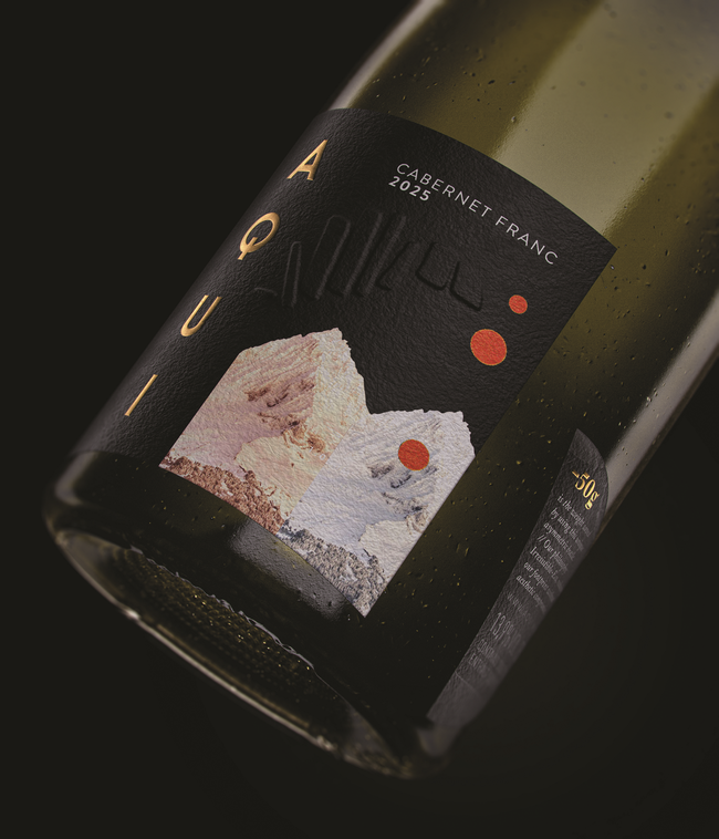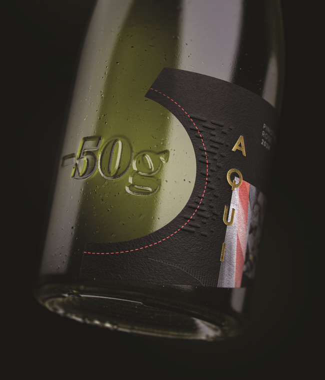 總部位于柏林的機(jī)構(gòu)Ruska Martin Associates對(duì)Aqui-50g持反對(duì)態(tài)度,認(rèn)為完美既不進(jìn)化也不適應(yīng),因此是可持續(xù)性的對(duì)立面。設(shè)計(jì)師選擇了Estal的Prima 100%PCR Wild Glass型號(hào),因?yàn)樗牟AЦ?,因此更輕,而且“手工制作的外觀(guān)”-50g壓印在飾面上。標(biāo)簽由Fasson Cotton Extra White(Avery Dennison)制成,由于采用了模切“拼圖技術(shù)”,可以減少所需材料的數(shù)量。裝飾方面,標(biāo)簽是浮雕、數(shù)字印刷和燙印的Kurz箔。瓶子頂部有軟木塞(Diam的Origin型號(hào))和蠟?zāi)z囊。
