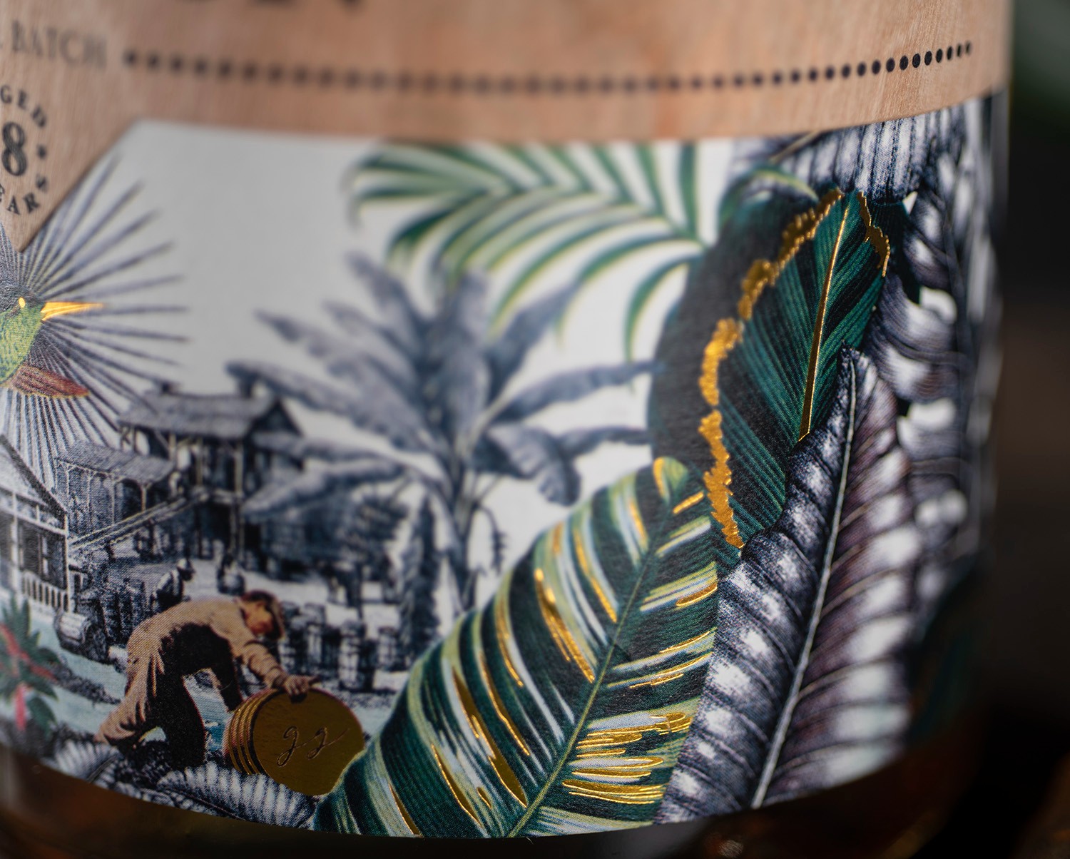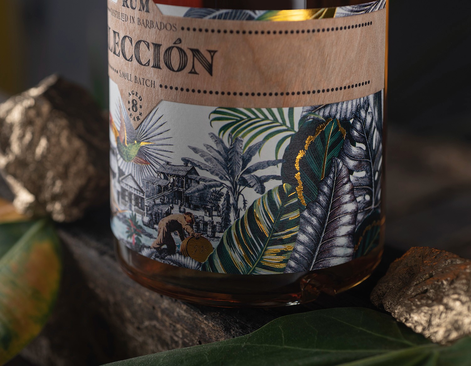 標(biāo)簽由兩張不同的紙組成,一張非常熱帶的拼貼畫,上面有典型的巴巴多斯植物和動物,在有紋理的白紙上有殖民建筑,上面是一張寫有朗姆酒名稱和類型的木板。衣領(lǐng)因其在衰老過程中的清醒而引人注目,黑色木塞將其封閉,使其優(yōu)雅。