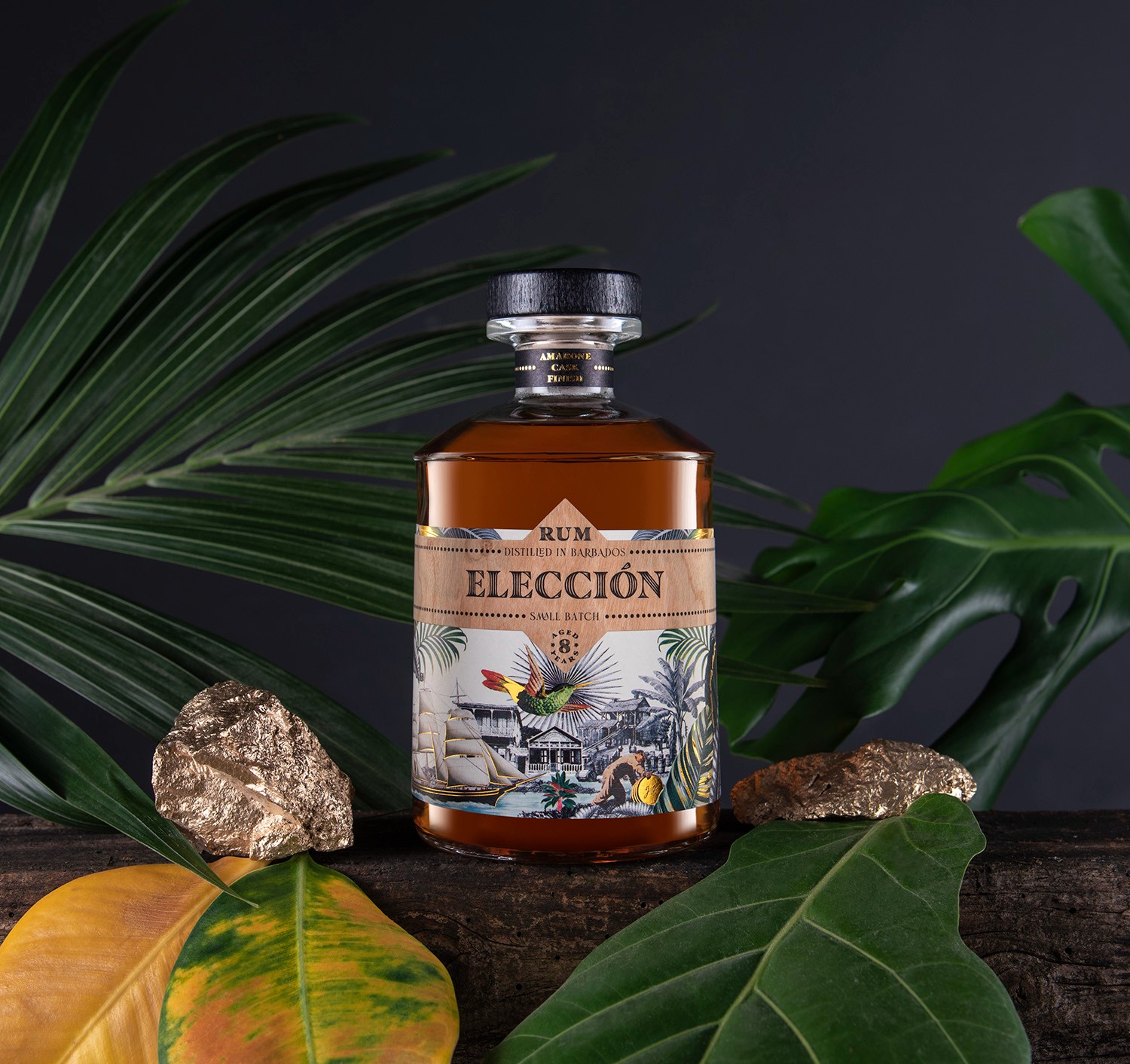 為Ron Elección的意大利客戶設(shè)計(jì)包裝。這種朗姆酒在巴巴多斯蒸餾,但在阿瑪龍酒桶中陳釀,這是意大利的典型做法。