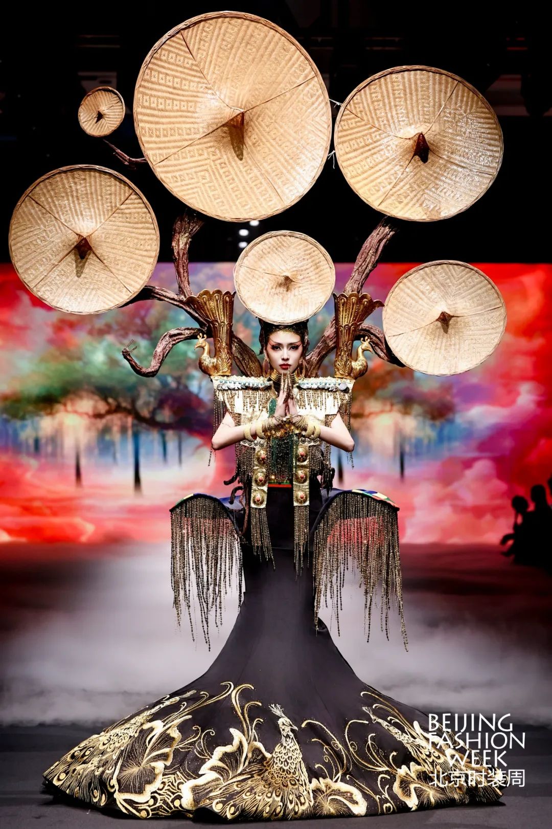 非遺技藝在張珂嘉的設計中也得到了活化利用。他以設計之形接納技藝之魂,例如對花腰傣竹編斗笠進行尺寸的重新設計,將其納入主秀造型。同時,輔以象征天地與自然的 “宇宙樹”,讓這些承載著多民族文化與記憶的元素再次煥發(fā)出新的生機,綻放出永恒的魅力。