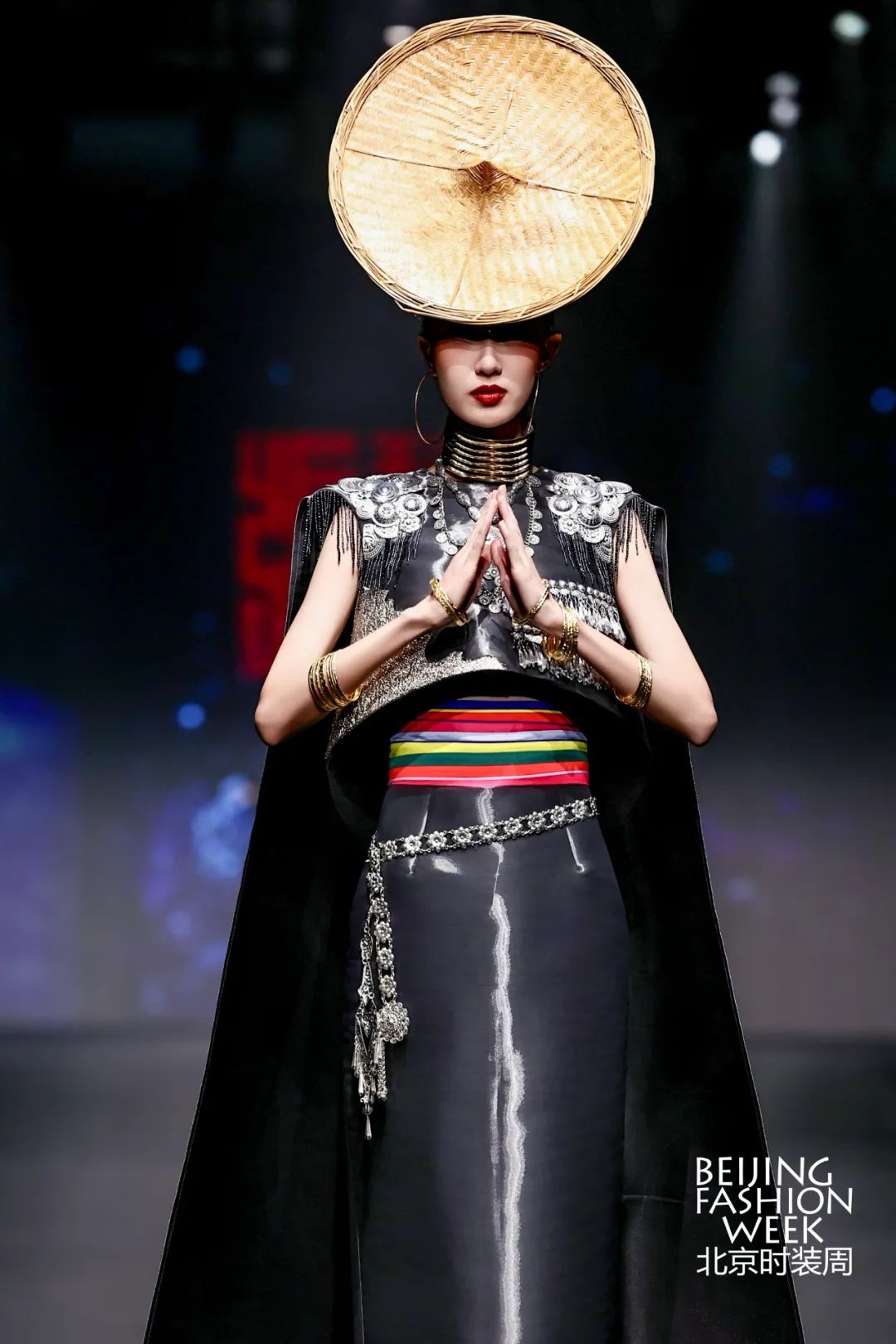 就像那件黑色的苗族創(chuàng)新概念禮服,梯田的形象幻化成肩上柔和的線條,模特肩上的鎧甲成為苗族英勇的象征,雛雞翎模樣的飾物則凝結著多民族對自然崇拜的情感。這些設計元素的運用,無不體現(xiàn)出他對民族文化深刻的理解與尊重。