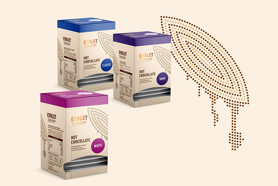 Evolet的選擇范圍是與口號“選擇與激情”一起開發(fā)的。關(guān)心茶樹生長的農(nóng)民的熱情。我的創(chuàng)造性解決方案是向消費(fèi)者展示善良的根源,葉,不是客觀化的,而是藝術(shù)的,葉子給你的心情,愛和對茶的熱情。這個想法是為了表達(dá)喝一杯好茶的真實(shí)感覺。在熱巧克力飲料系列中,茶葉被純可可豆所取代。