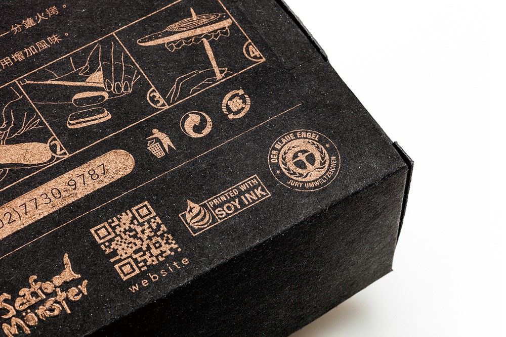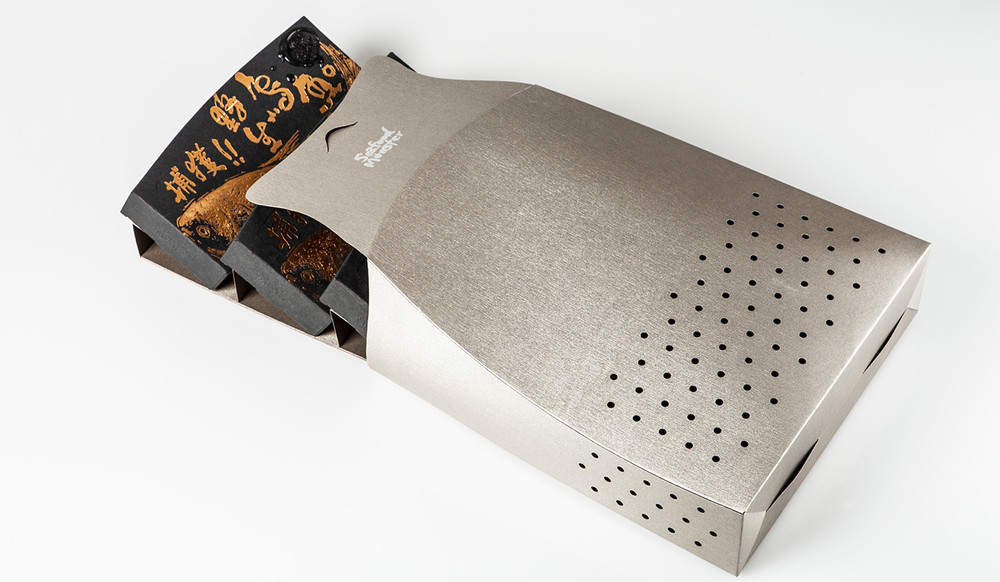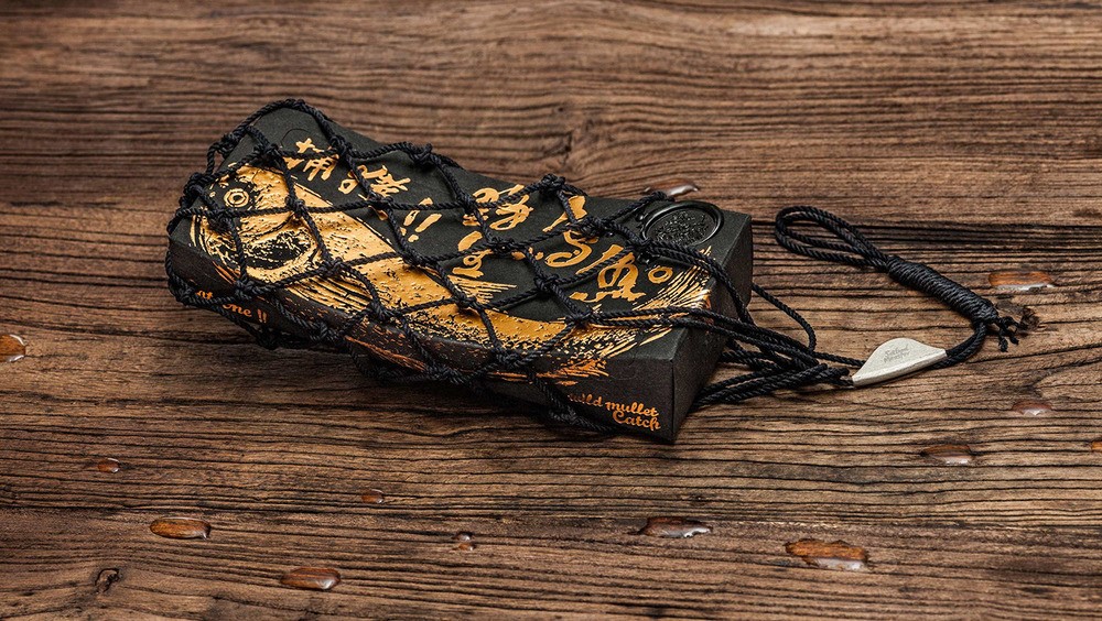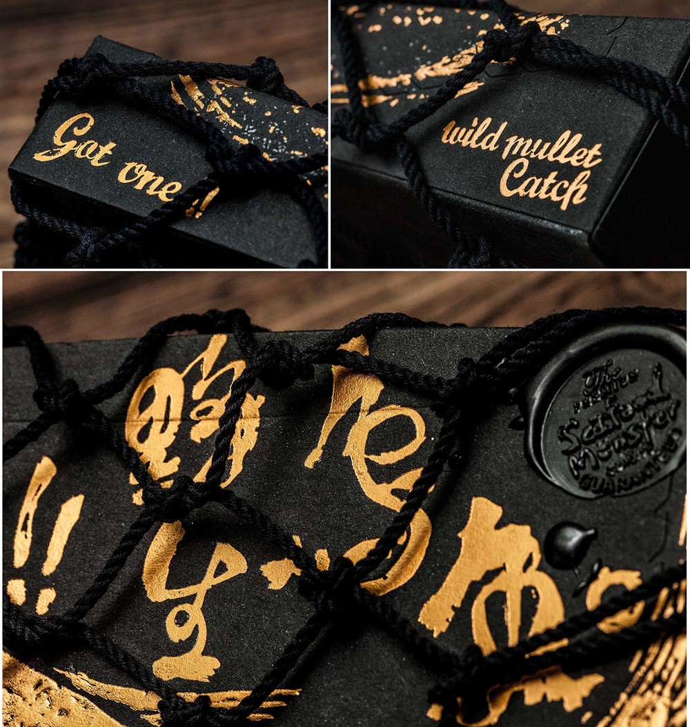 整個包裝北京設(shè)計小編認為絕對顛覆了對腥味濃重的烏魚包裝的刻板印象,黑色與金色的搭配,火漆印章和漁網(wǎng),讓你分分鐘感受傳統(tǒng)與高端。在色彩上,黑盒做出來的也是再生紙,盒體視覺效果都很有手工打造的感覺,當(dāng)消者使用該產(chǎn)品,并從漁網(wǎng)形狀的盒子中,打開取出產(chǎn)品時,他有一類似于親自體驗捕魚的喜悅,此包裝盒的底部設(shè)計用測量線,以方便烏魚子的切片燒制時,廚師可以自由切割各種尺寸的魚片。野生烏魚,從自然界中獲取,同生互存的概念,循環(huán)及環(huán)保的包裝理念。佳節(jié)伴手禮的好選擇。