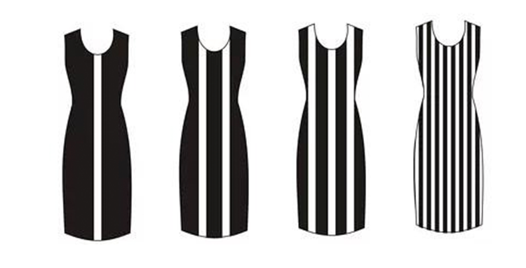 摩爾紋動態(tài)面料應(yīng)用,在平日里很多愛美的女生喜歡穿條紋長裙,從下圖中可以直觀地感受到,左一最顯瘦,從視覺的寬度上來說,隨著條紋增多,反而越發(fā)有“膨脹感”、“厚重感”。因此,在買條紋裙子的時候,想要穿著顯瘦點(diǎn),大家可以選條紋大的裙子。