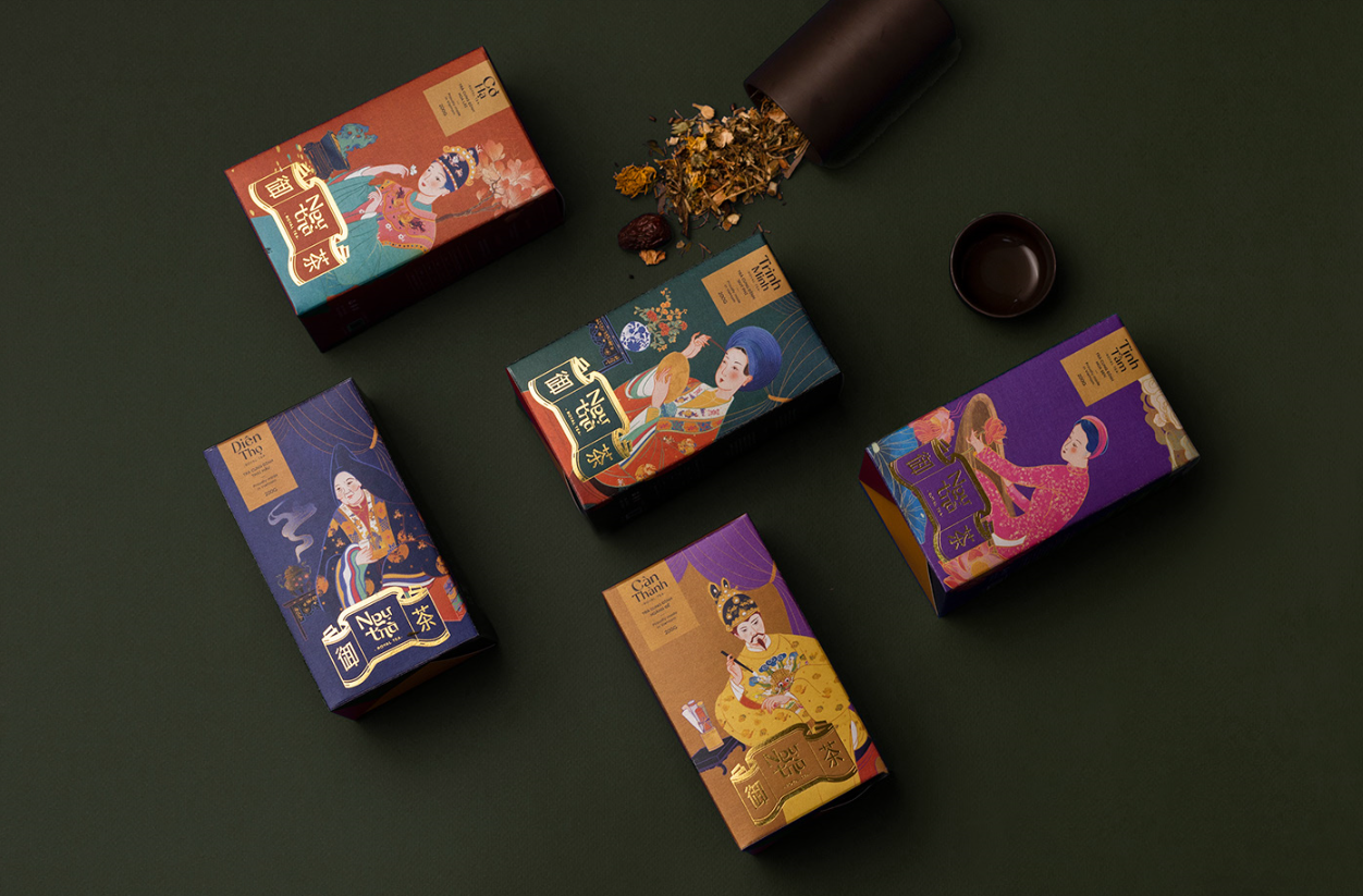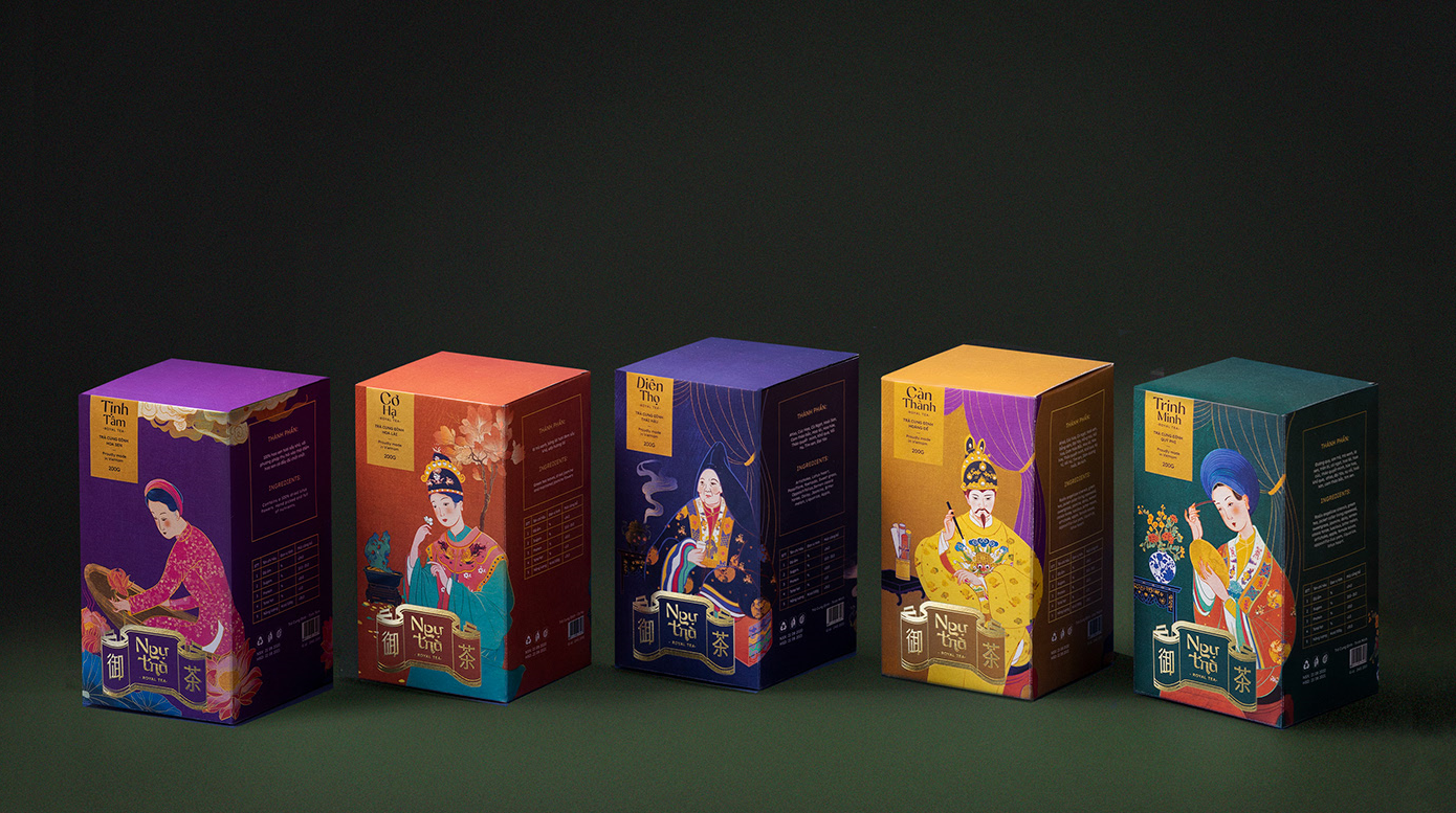 “Ng?Trá”的包裝靈感來源于皇宮——皇妃們居住的天明宮、帝國下榻的燦丹宮和王母娘娘下榻的奠陀宮。對于荷花和茉莉花茶,我取了順化宮著名的地方:天潭湖和可可哈花園。我還為這五種不同的茶制作了一系列的插圖,它們的靈感都來自皇家色調(diào)。