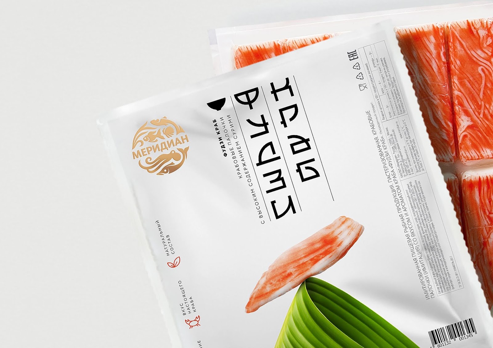 魚糜起源于日本。因此,作為視覺上的隱喻,我們選擇了神秘的日本及其主要符號:富士山。設(shè)計反映了美食的想法。干凈,簡約的布局強調(diào)了產(chǎn)品的高質(zhì)量。包裝上有一張類似富士山的折疊竹葉插圖。蟹棒描繪在最上方,是“味覺巔峰”的圖形隱喻。包裝設(shè)計理念得到了日本書法風(fēng)格的“ Fuji Crab”的支持。傳遞消費者信息的垂直布局增強了隱喻性信息,同時讓人聯(lián)想到日語寫作的特征。該產(chǎn)品的主要優(yōu)點以圖標(biāo)的形式顯示在左側(cè),以簡化消費者對其的閱讀。魚糜起源于日本,其包裝上有一個類似富士山的折疊竹葉的插圖。