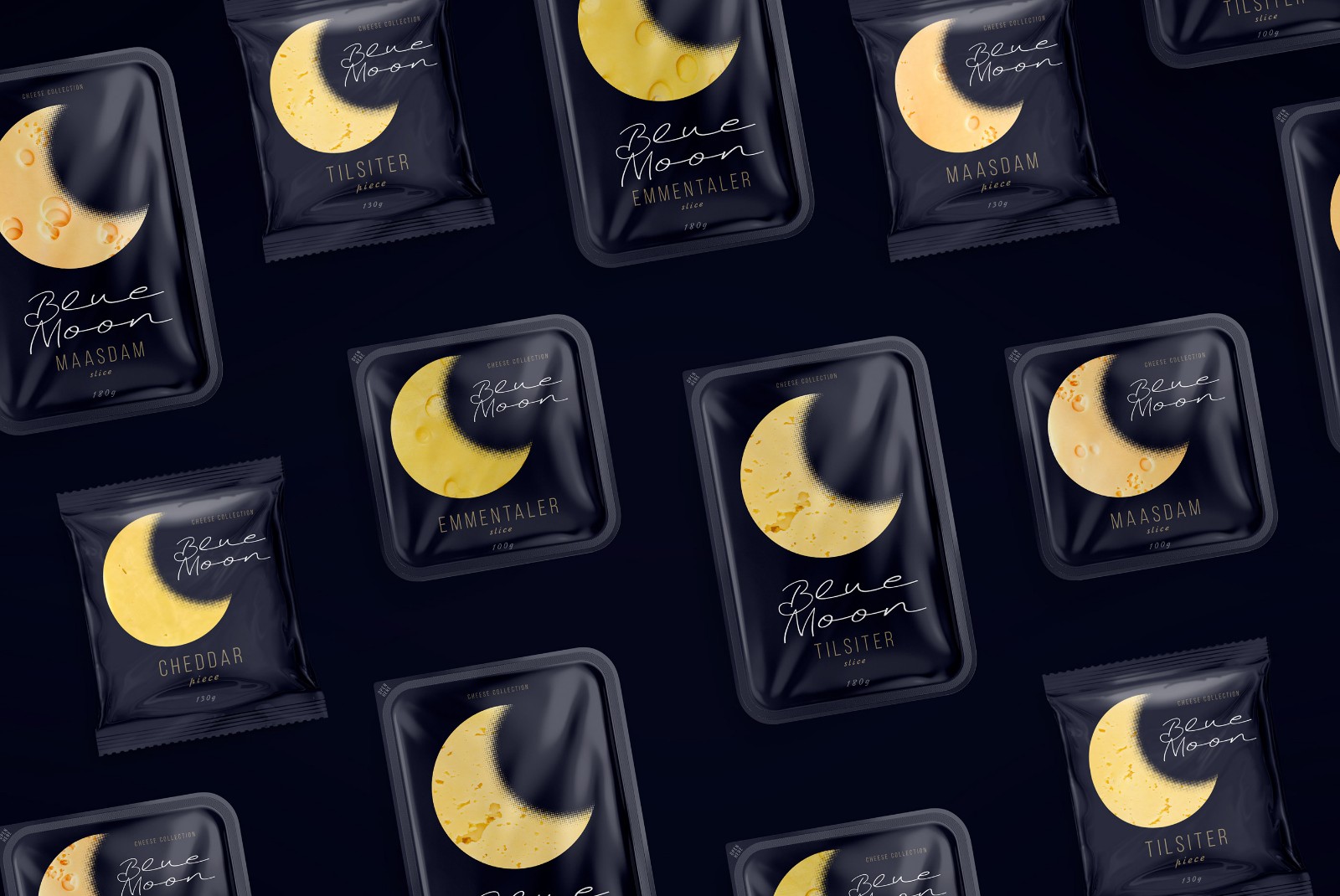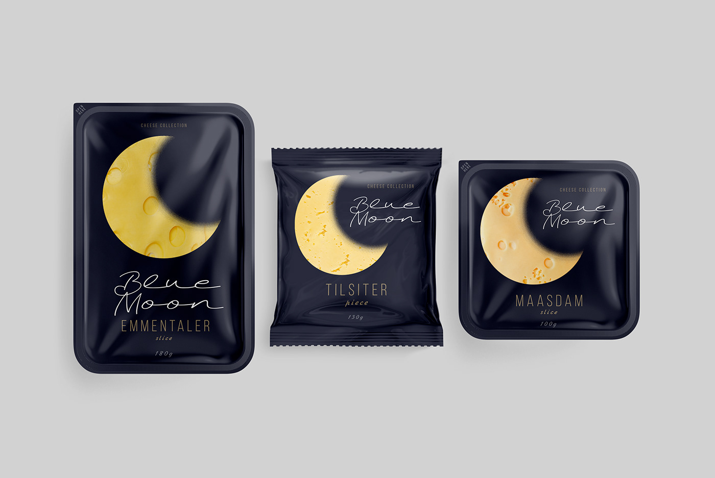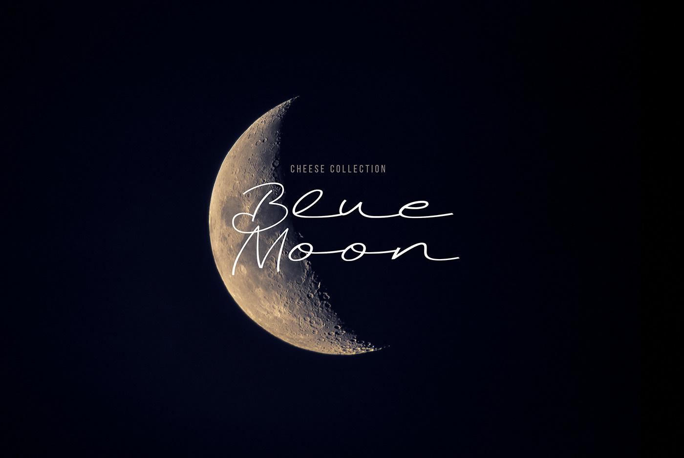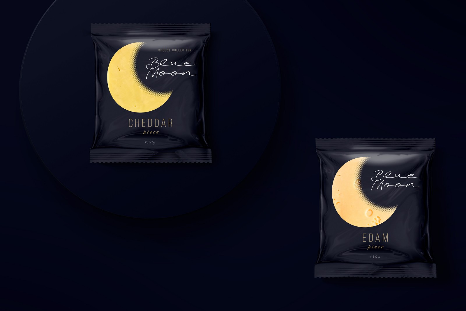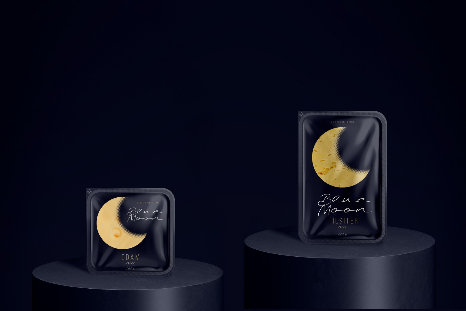 When developing the design for the line of cheeses, we wanted to highlight a specific product advantage. Thanks to their composition, Blue Moon light cheeses are perfect for a quick evening snack, without consequences for the figure and diet. The main element was the month, as a symbol of the time of day and at the same time a recognizable visual image-comparison. The yellow color and craters of a celestial object have long been a humorous metaphor for cheese in popular culture. Continuing the idea of ??the moon, we chose a deep night blue. In addition to the semantic designation of twilight, it creates a simple, laconic background against which the corporate element - the month, like a slice of cheese - stands out clearly and is easily read.
