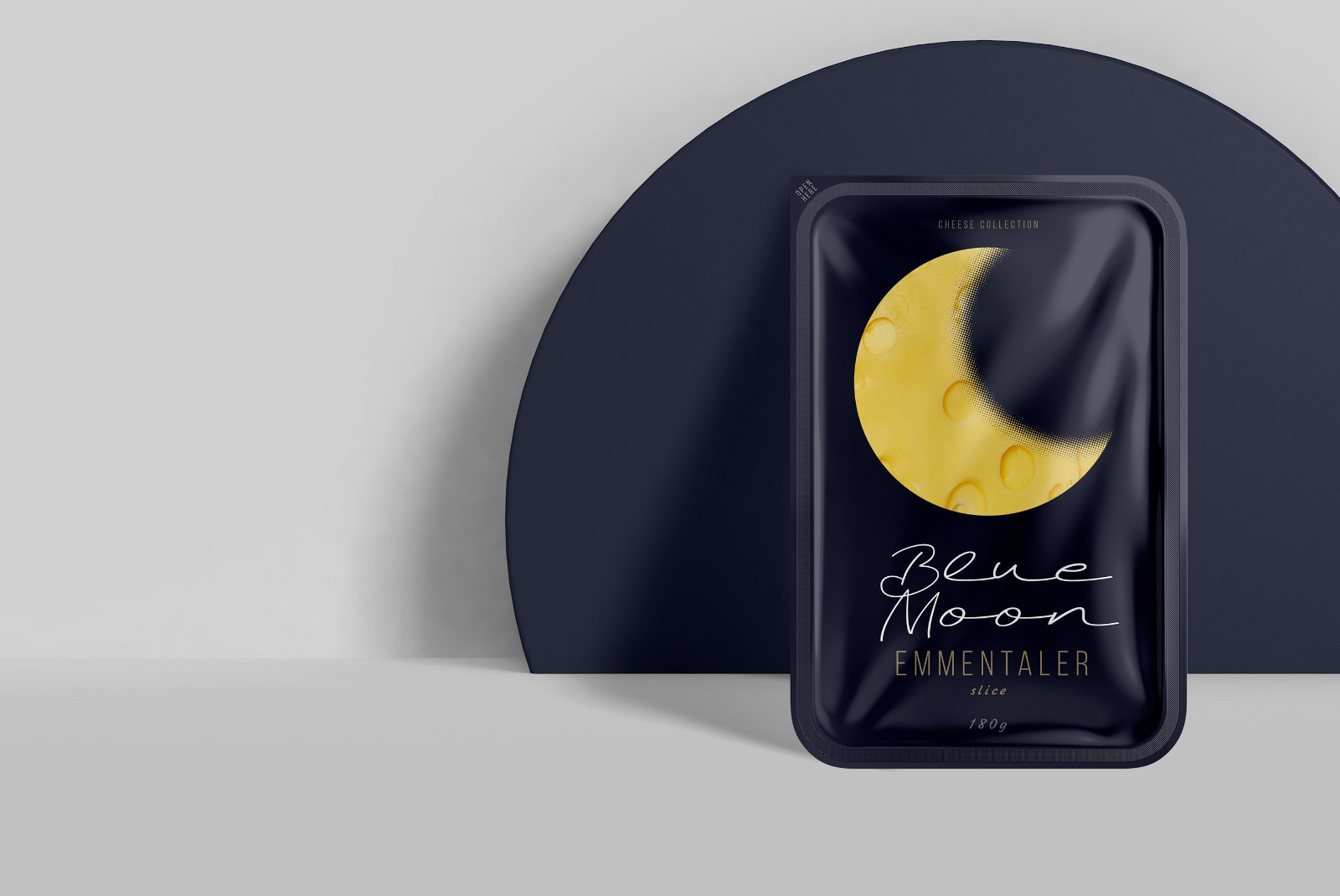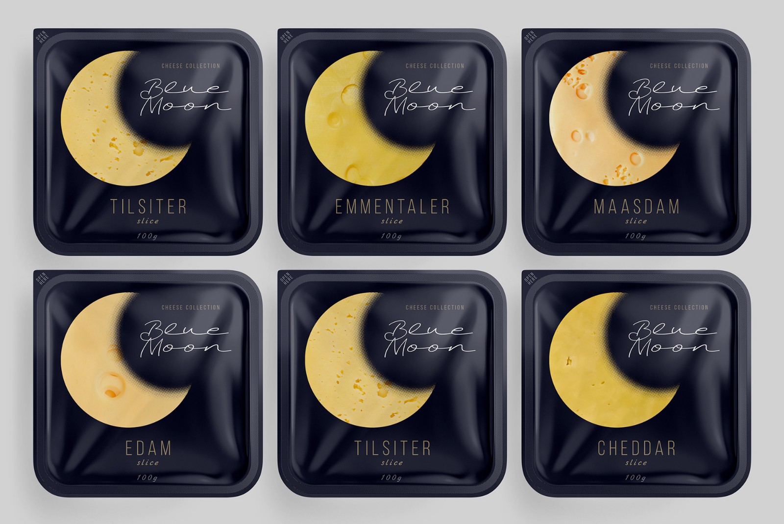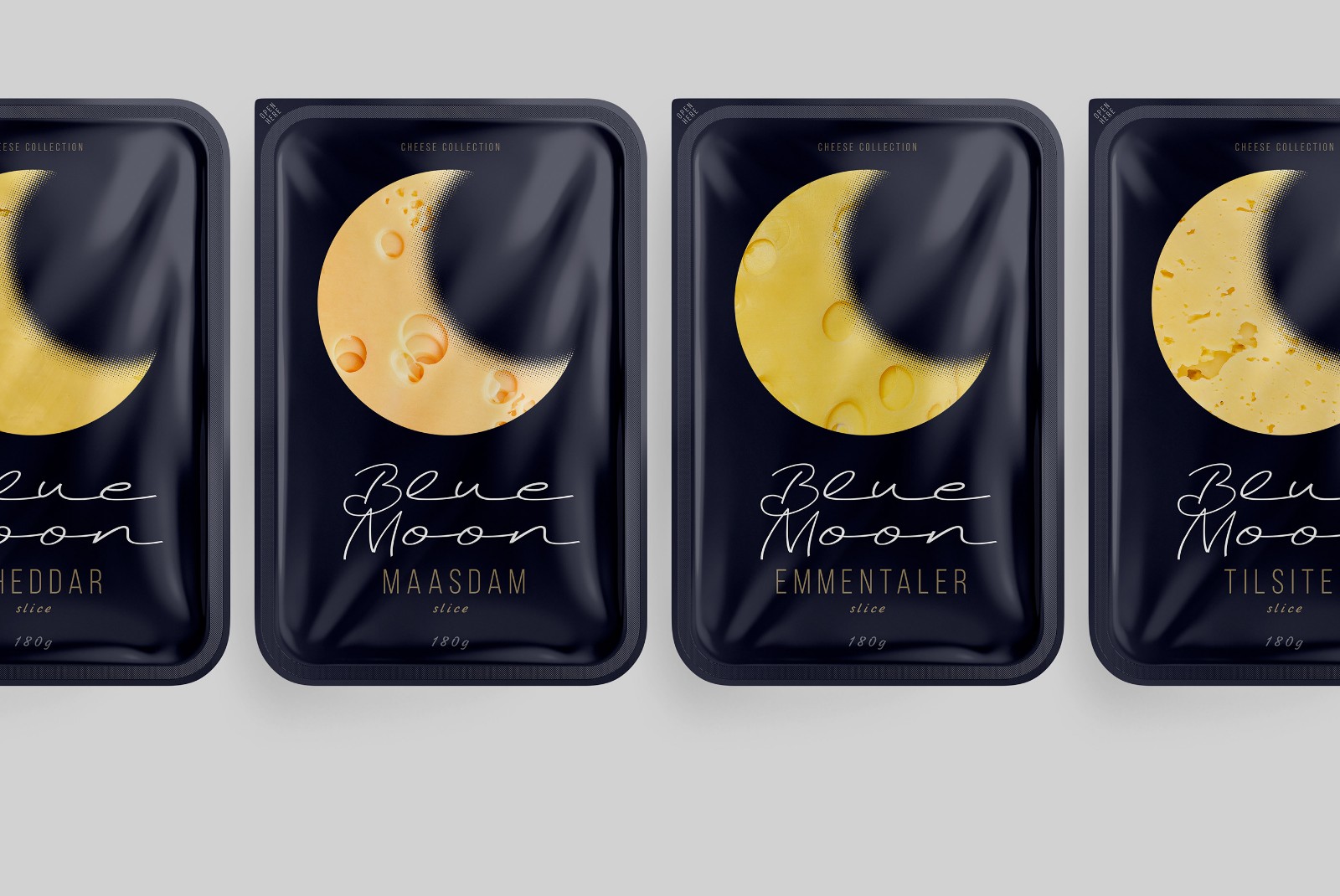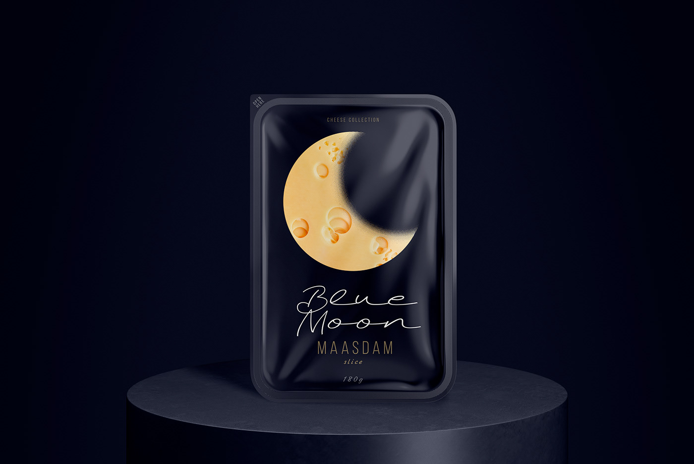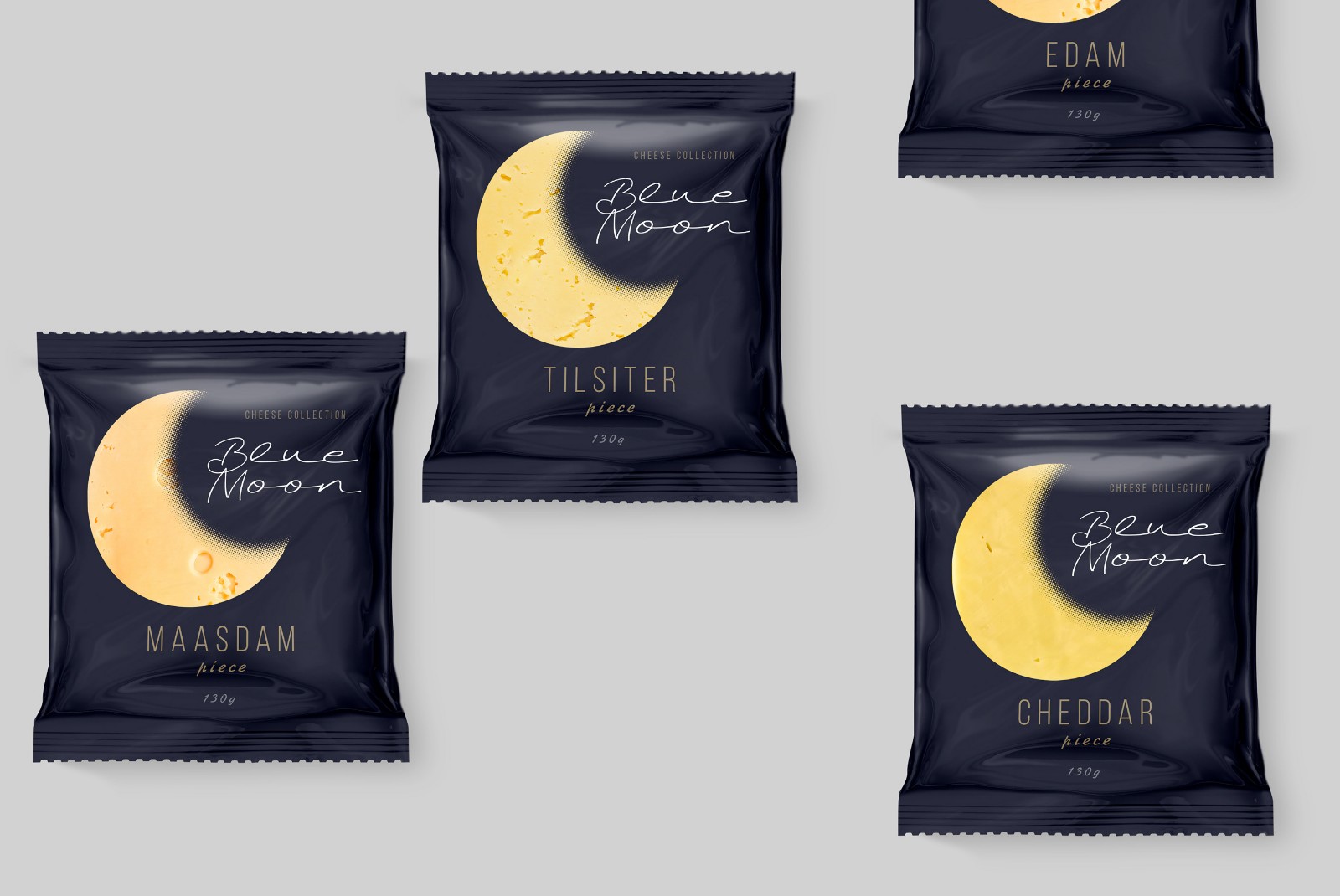 When developing the design for the line of cheeses, we wanted to highlight a specific product advantage. Thanks to their composition, Blue Moon light cheeses are perfect for a quick evening snack, without consequences for the figure and diet. The main element was the month, as a symbol of the time of day and at the same time a recognizable visual image-comparison. The yellow color and craters of a celestial object have long been a humorous metaphor for cheese in popular culture. Continuing the idea of ??the moon, we chose a deep night blue. In addition to the semantic designation of twilight, it creates a simple, laconic background against which the corporate element - the month, like a slice of cheese - stands out clearly and is easily read.