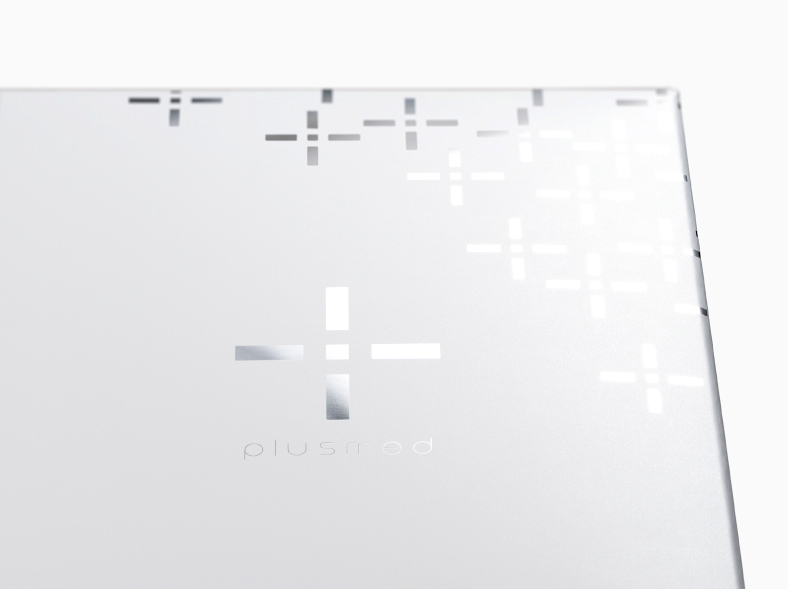 將醫(yī)學(xué)十字架創(chuàng)意極簡形態(tài),中間的支點是不變的初心,四條線也有光線的感覺,與醫(yī)學(xué)美容行業(yè)相符,PLUSMED美容產(chǎn)品的創(chuàng)意包裝,銀卡紙禮盒,高端清爽,大氣時尚。