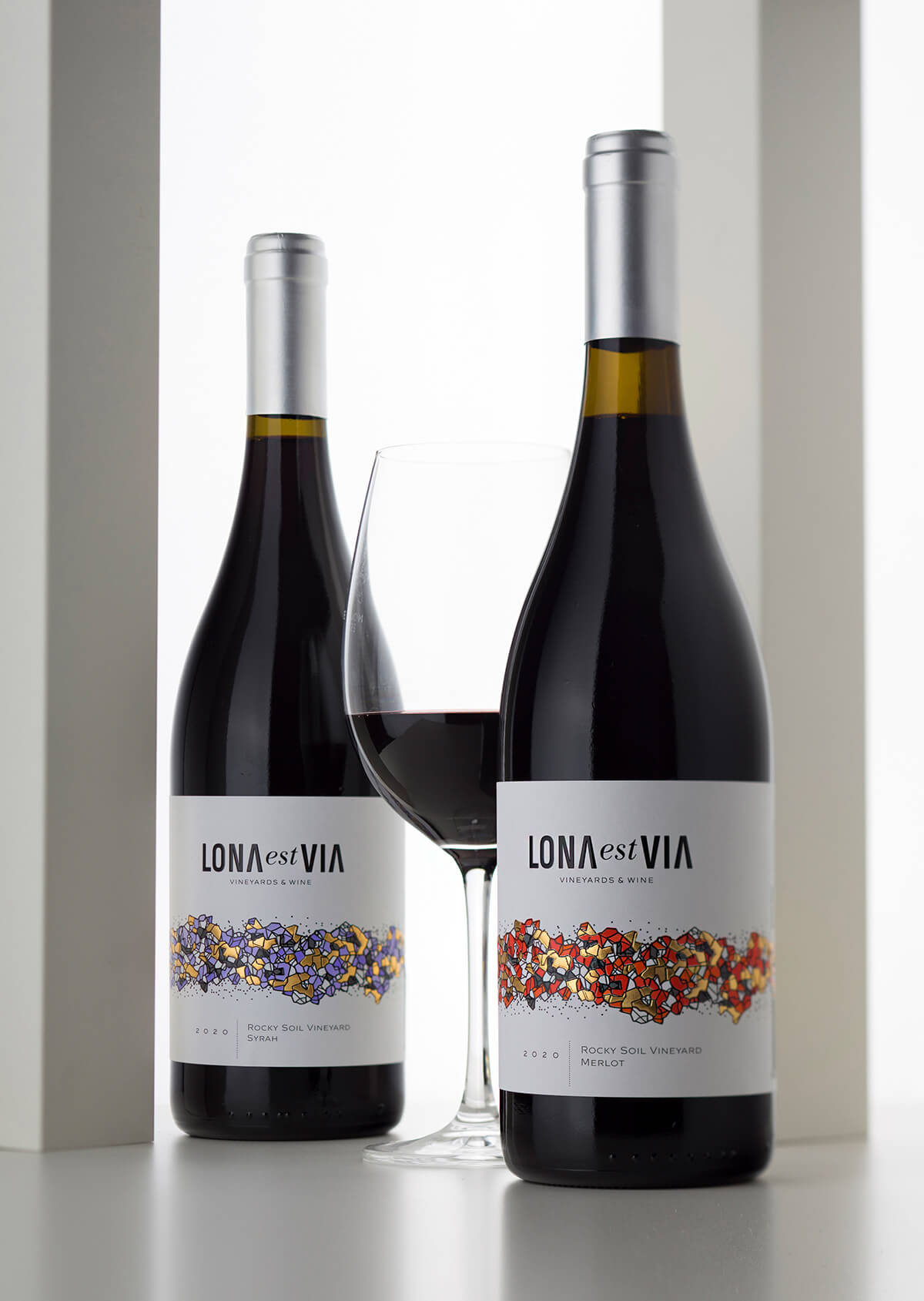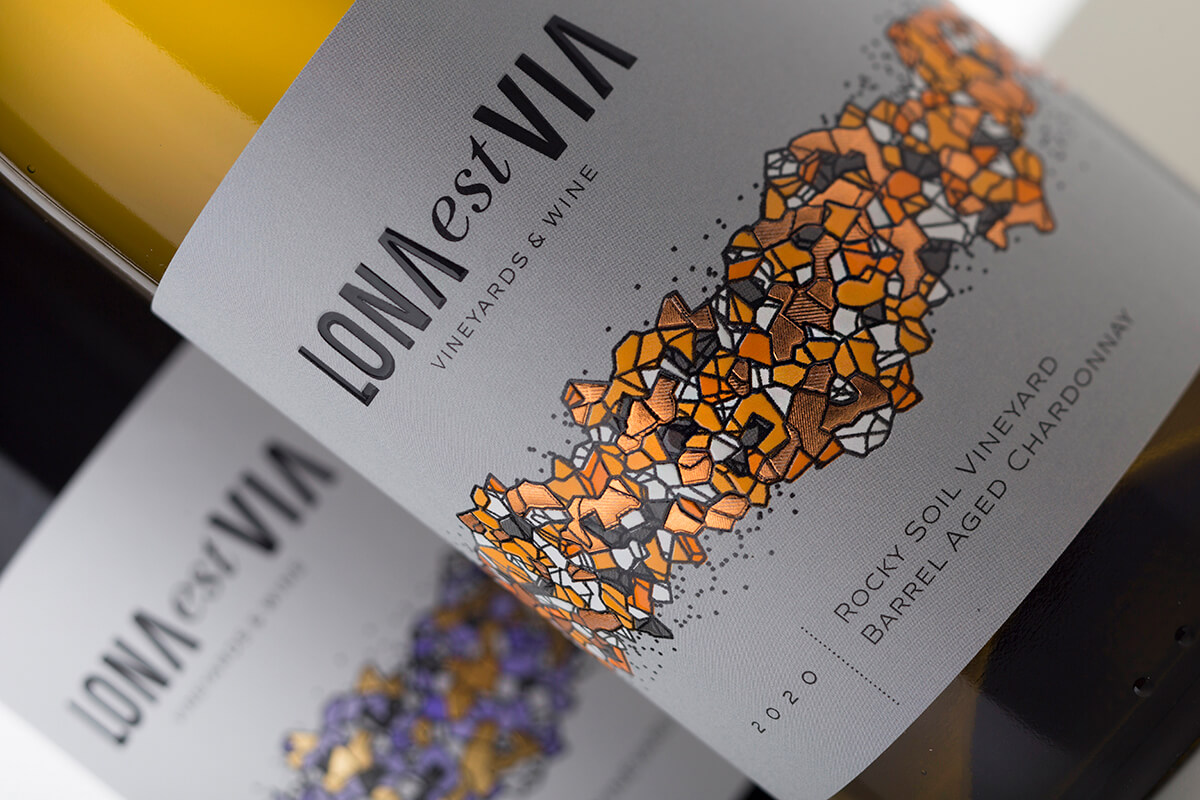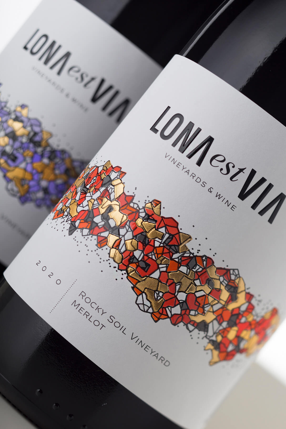 為了增強所有這些反射,我在每塊印有熱箔的石頭上使用了微壓花和強力壓花,而另一個用墨水印刷的則在上面涂上了凸起的清漆,這樣最后整個條紋看起來像一個 3D 圖像,尤其是在不同的光線條件下. 我的主要想法是在這個包裝標簽中創(chuàng)建非常吸引人的彩色條紋,以便人們可以輕松記住它。我還想大聲說,這些石頭是 Sredno Gradishte 村周圍這片神奇風土的真正寶藏。標簽的頂部中心是“LONA est VIA”標題,我使用定制的無襯線字體和藝術草書字母之間的優(yōu)雅組合來連接 LONA 和 VIA。我想在這個酒標設計上有一個非常清晰易讀的標題,但我不想看起來很簡單。