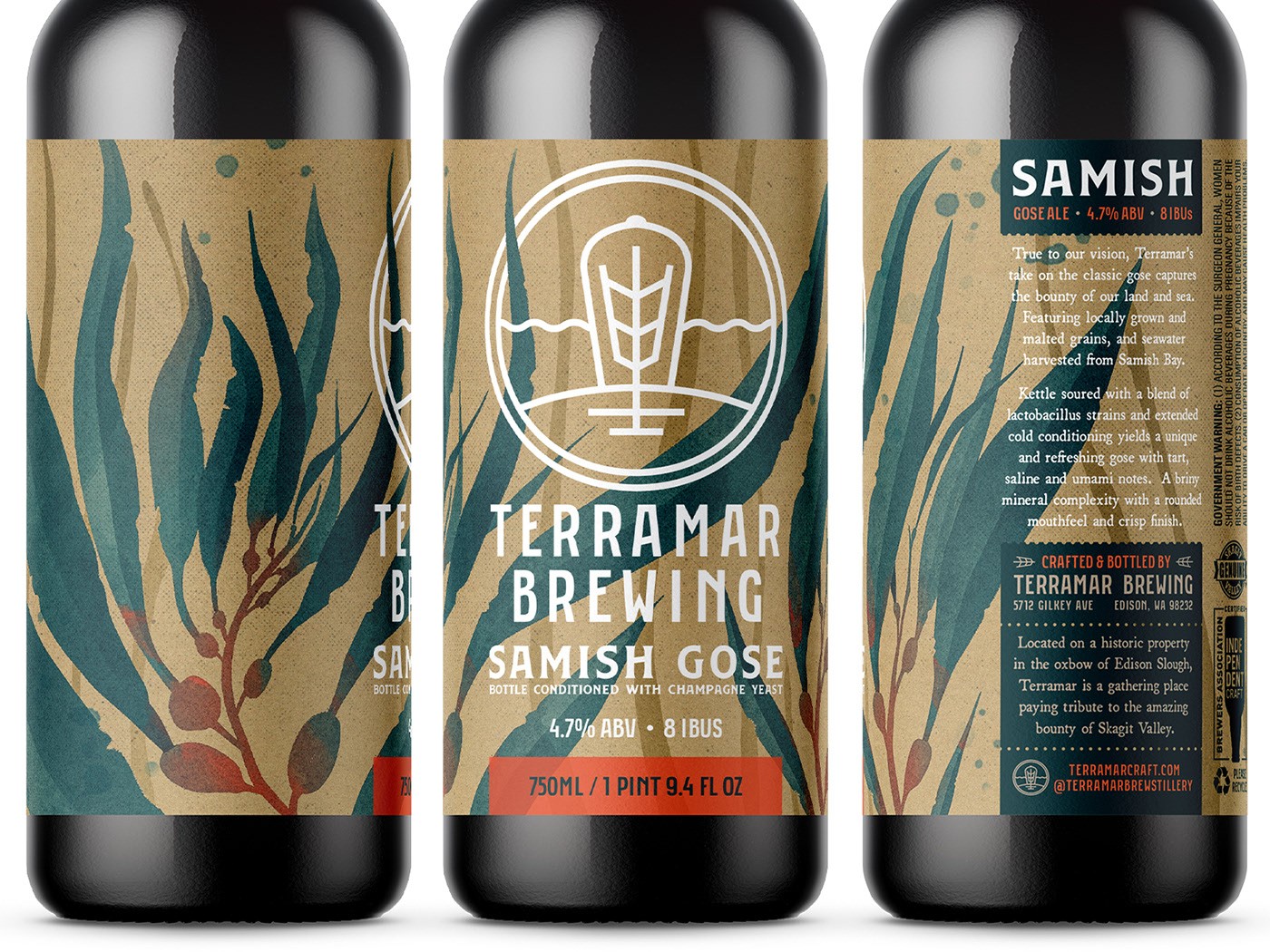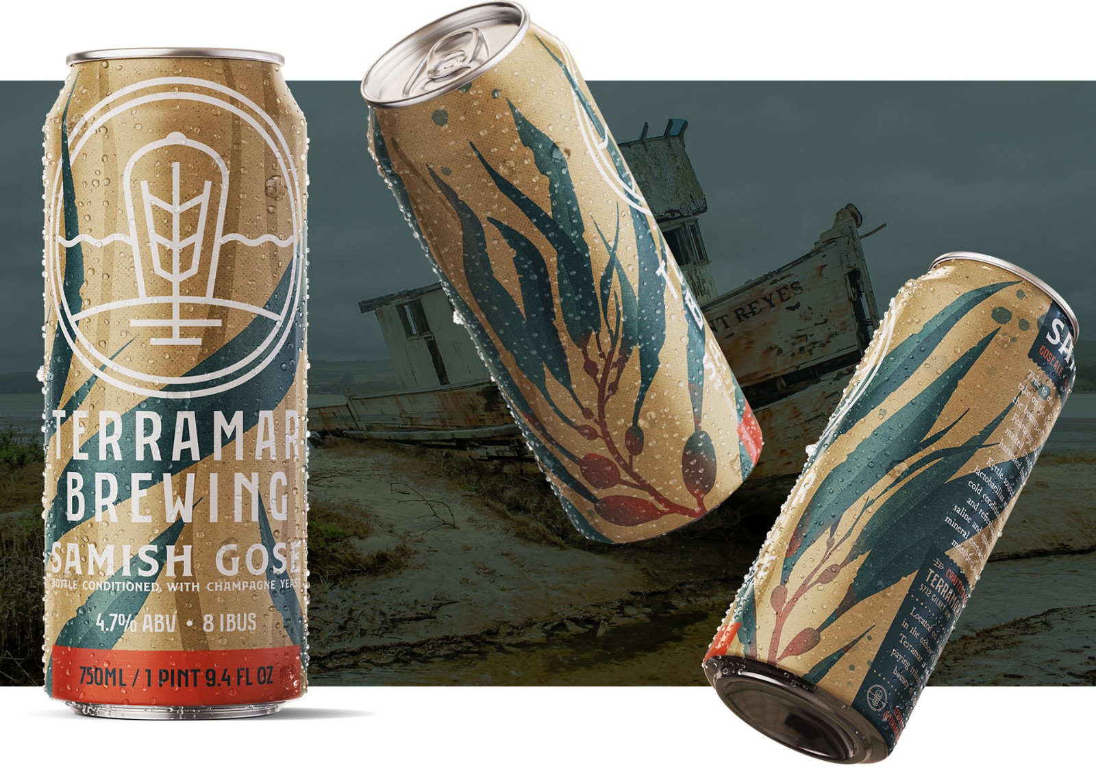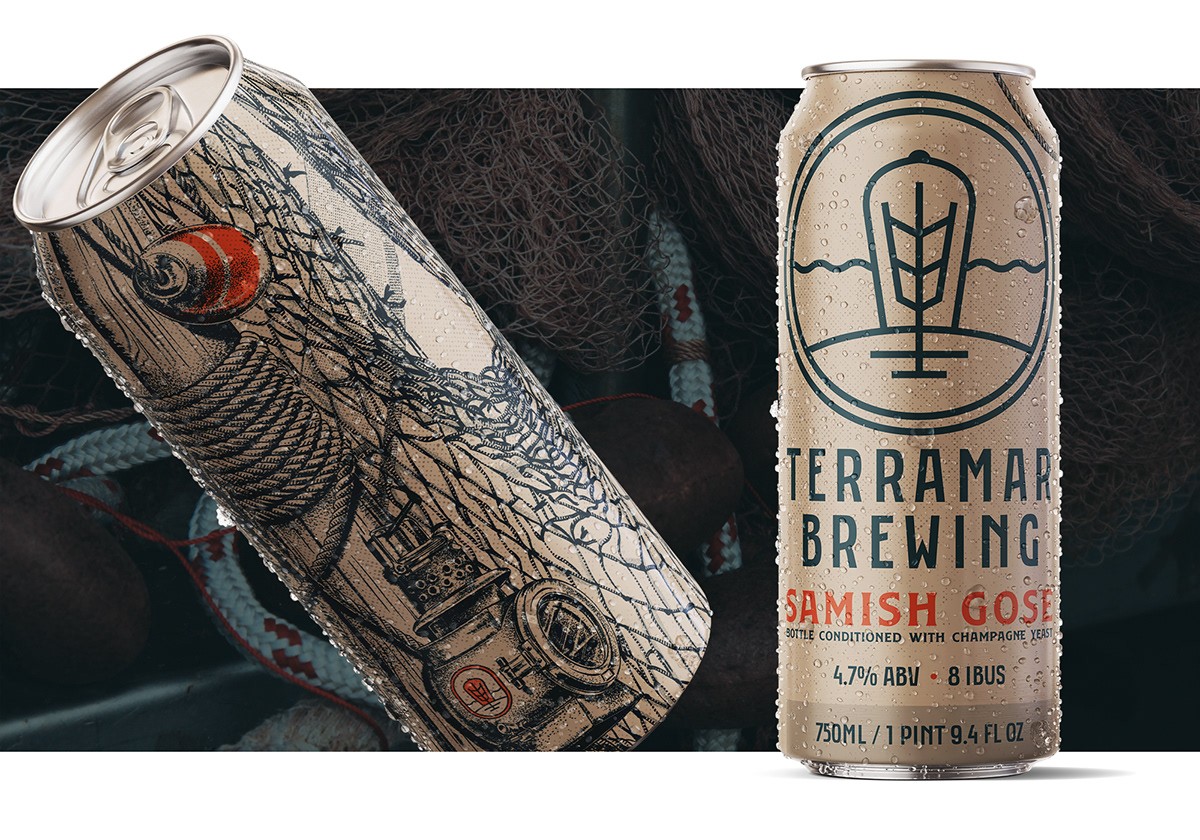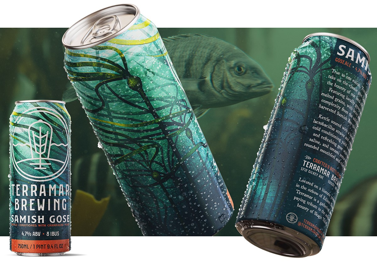 Terramar 的 Samish Gose,一個 750 毫升的瓶子,看看這些設(shè)計如何轉(zhuǎn)化為 16 盎司的罐子,以水彩風(fēng)格的巨型海帶(sp. Macrocystis pyrifera)的繪畫效果圖為中心