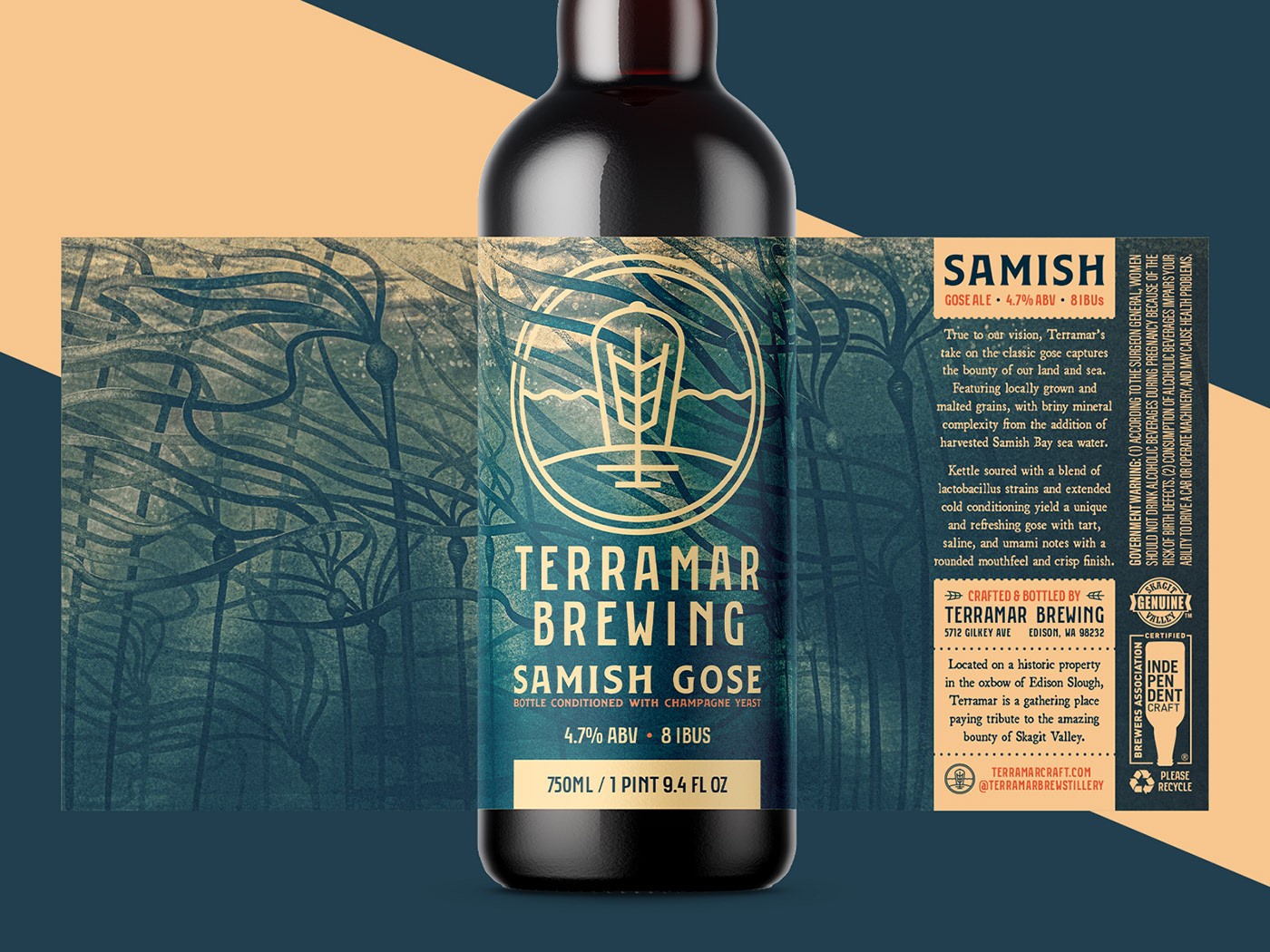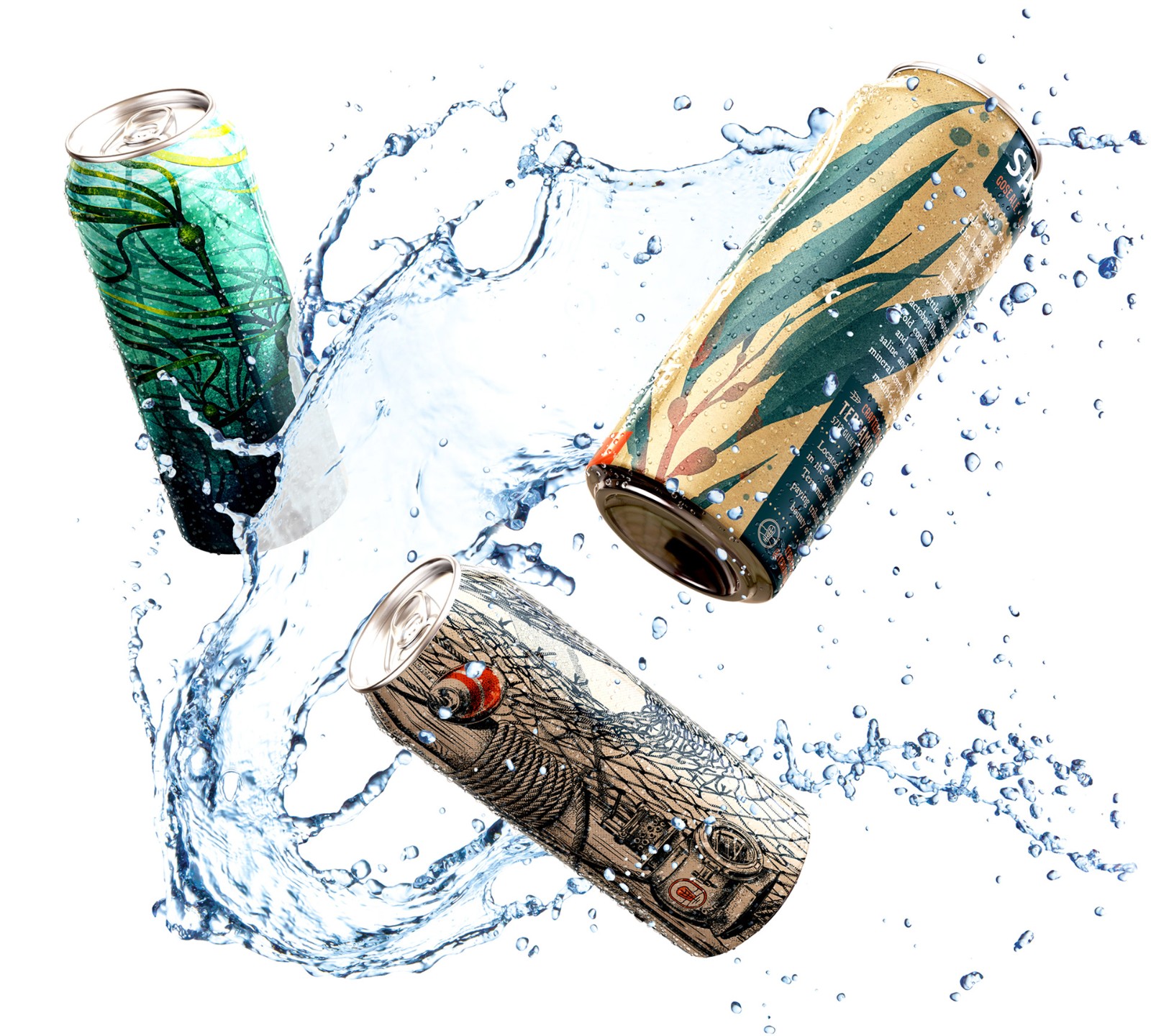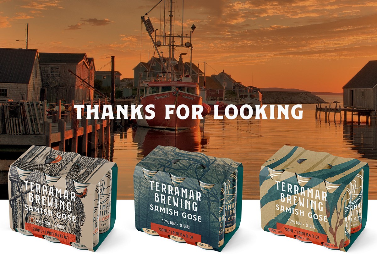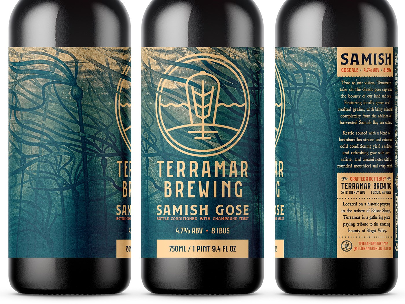 Terramar 的 Samish Gose,一個 750 毫升的瓶子,看看這些設(shè)計如何轉(zhuǎn)化為 16 盎司的罐子,以水彩風(fēng)格的巨型海帶(sp. Macrocystis pyrifera)的繪畫效果圖為中心