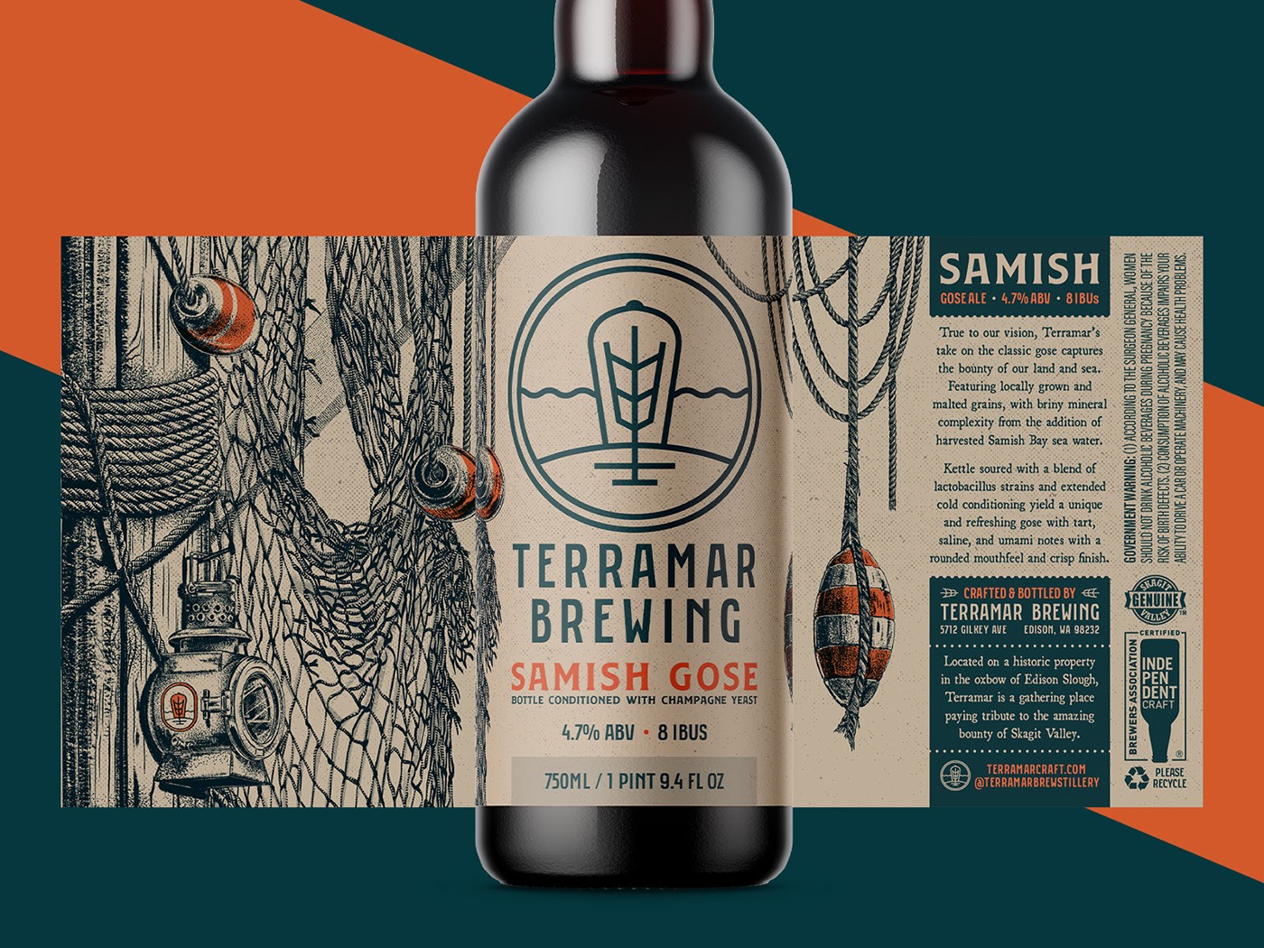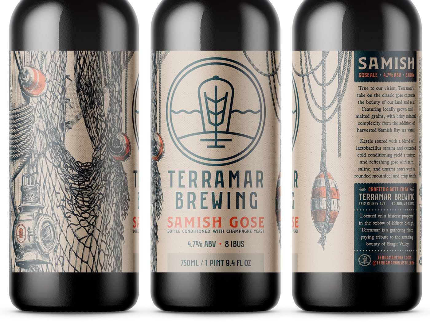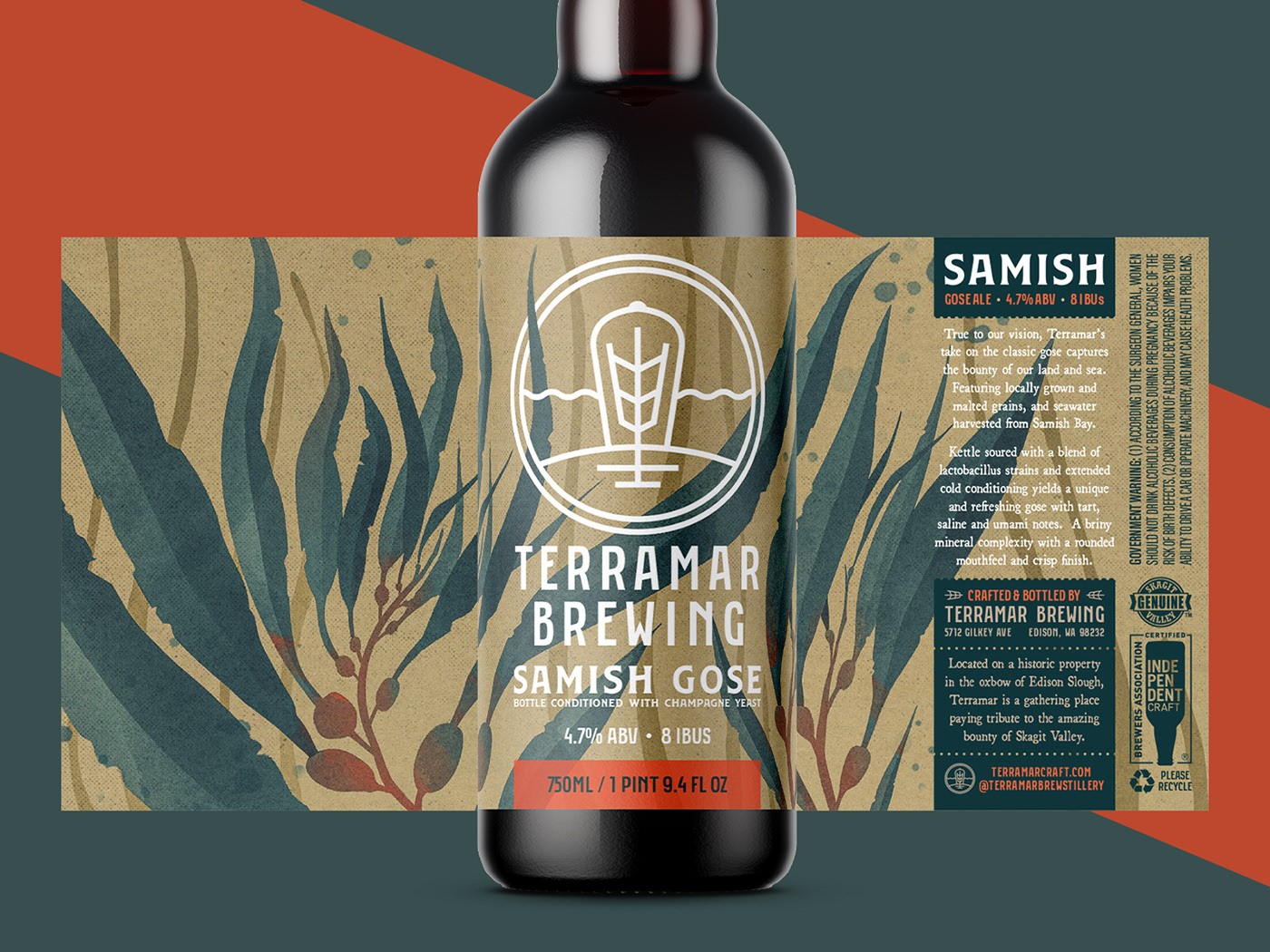 Terramar 的 Samish Gose,一個 750 毫升的瓶子,看看這些設(shè)計如何轉(zhuǎn)化為 16 盎司的罐子,以水彩風(fēng)格的巨型海帶(sp. Macrocystis pyrifera)的繪畫效果圖為中心