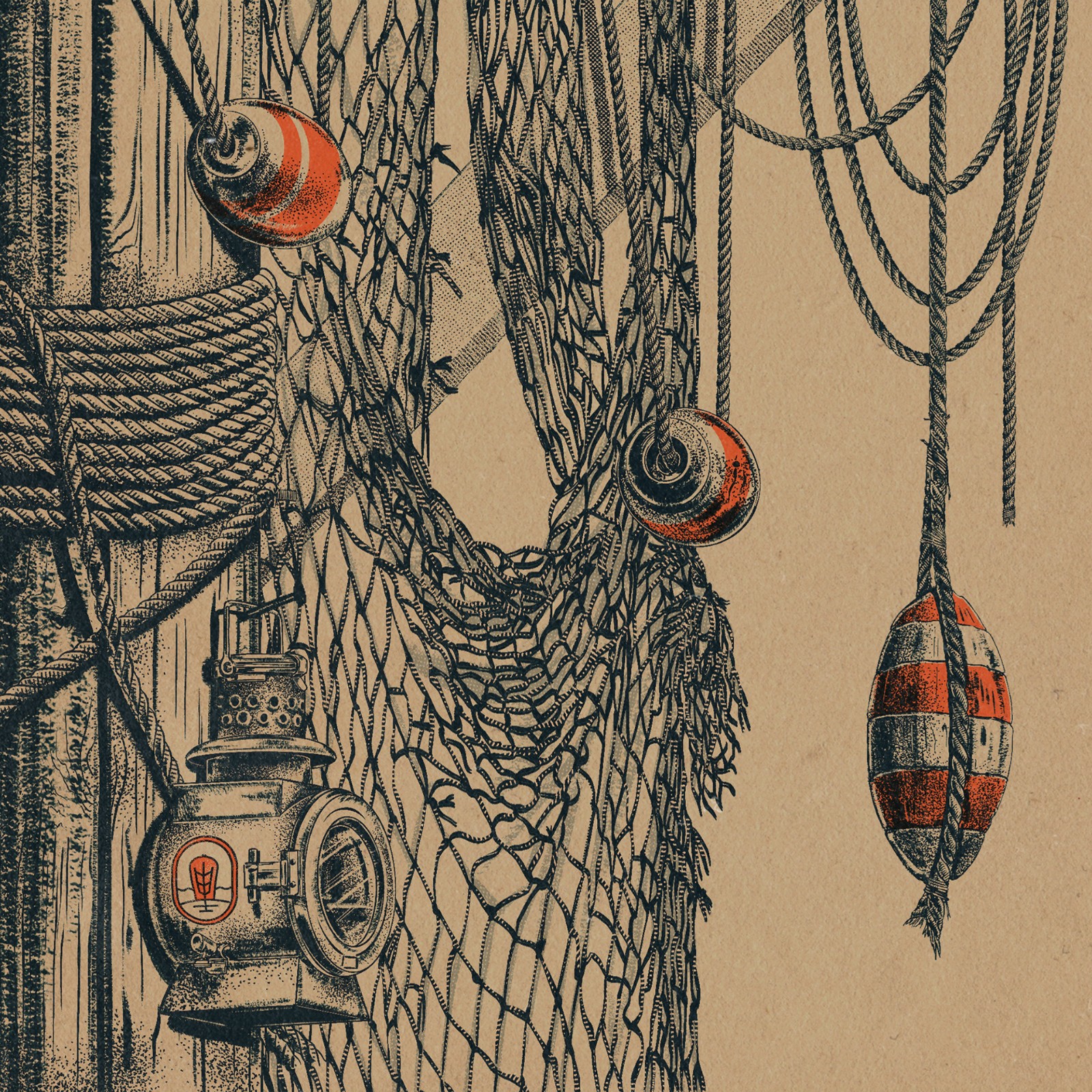 這個概念結(jié)合了漁船索具、燈籠、浮標(biāo)和漁網(wǎng)的插圖圖像。