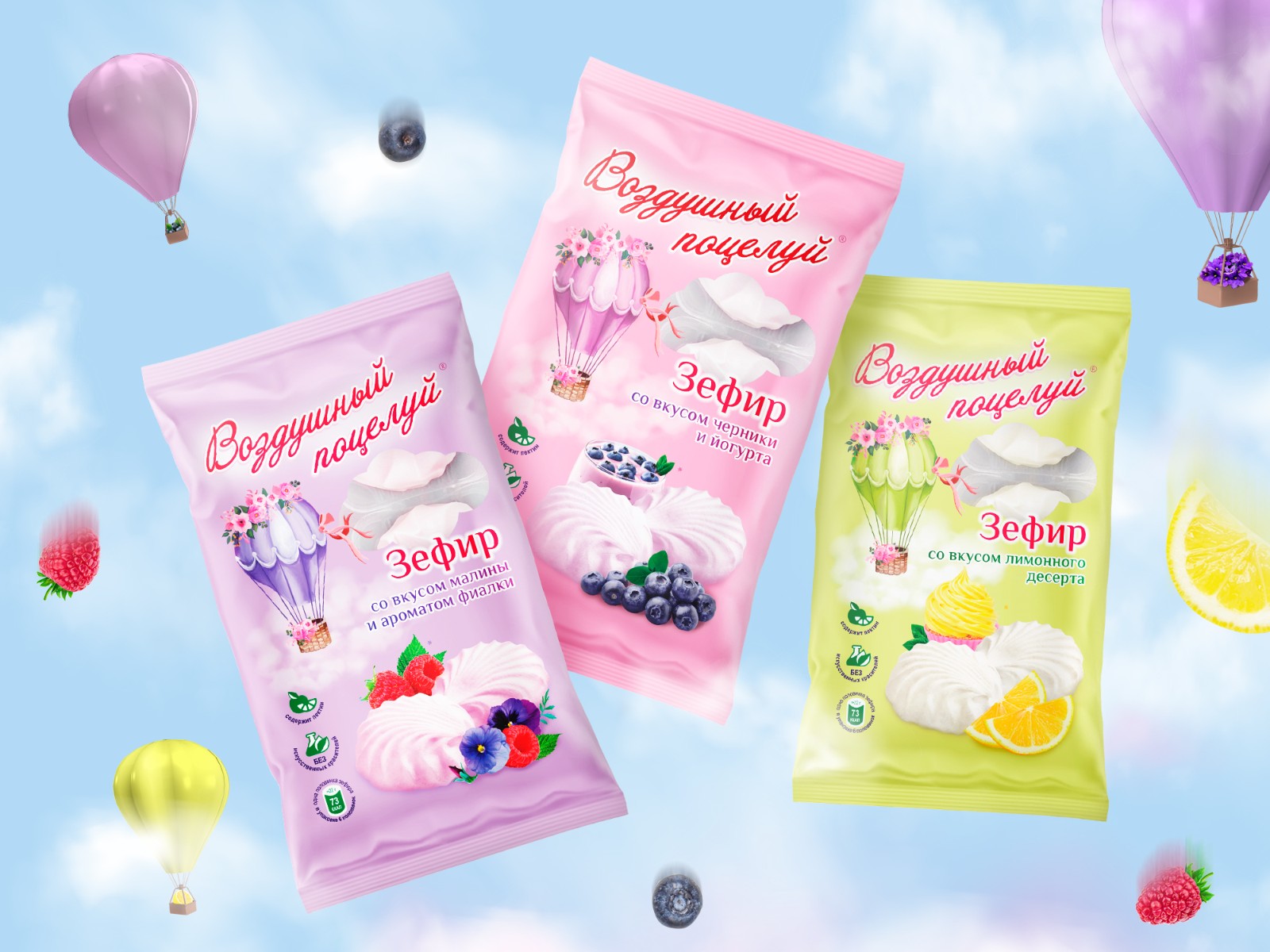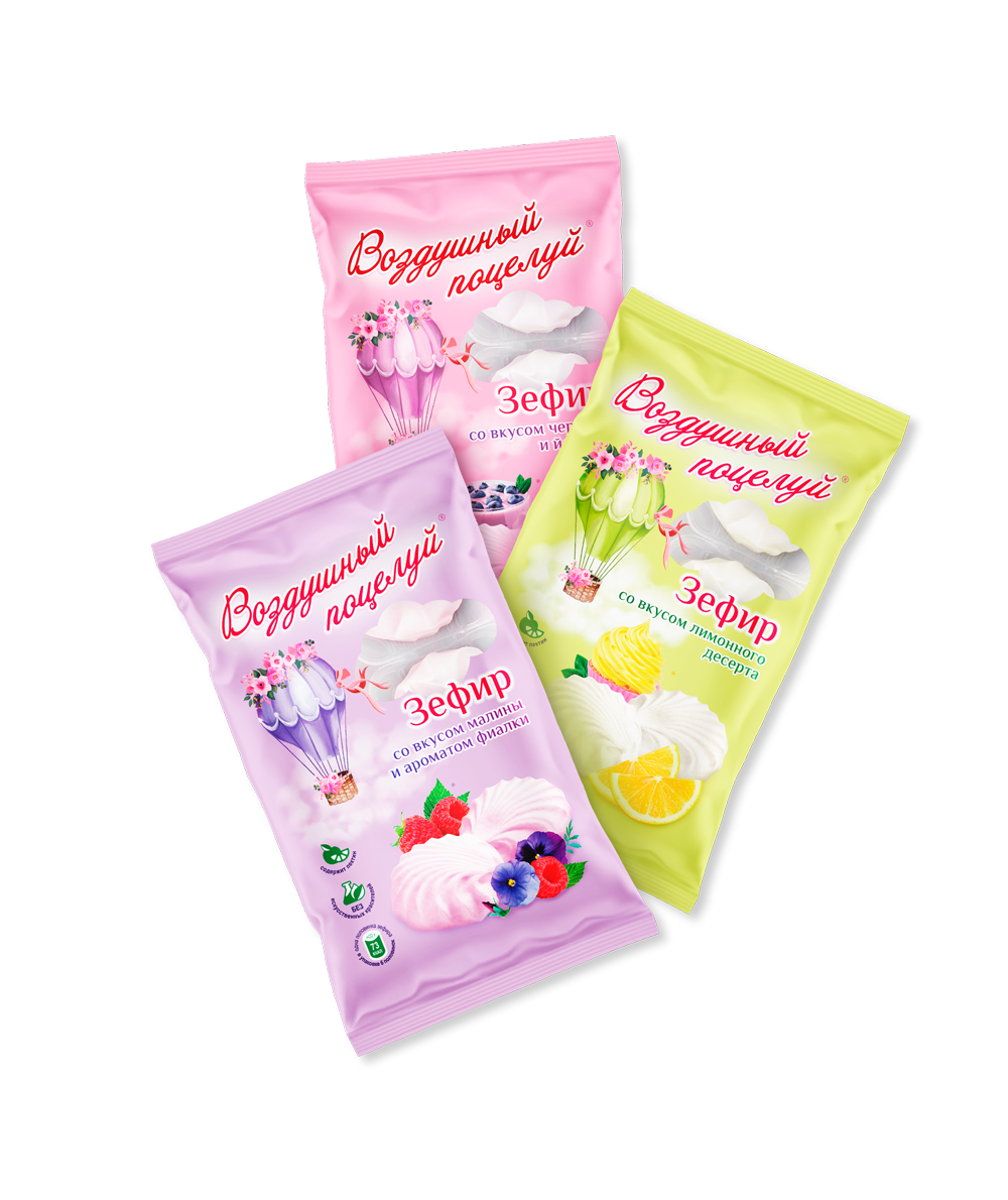 三種口味的棉花糖系列 Air Kiss 的包裝設(shè)計(jì):Sormovskaya Confectionary Factory 品牌的覆盆子紫羅蘭、檸檬甜點(diǎn)、藍(lán)莓酸奶。